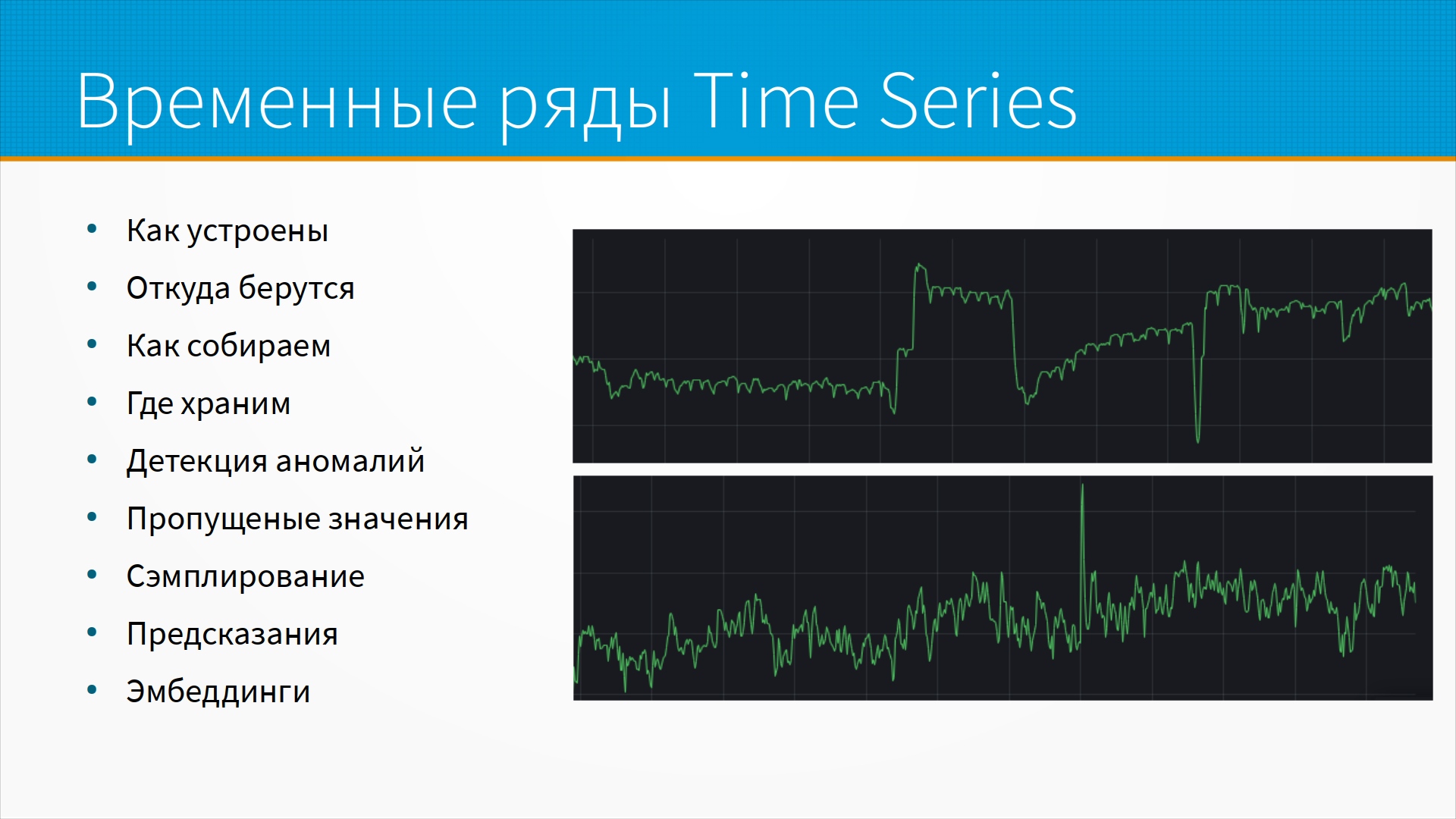 Вообще говоря, все это довольно неочевидные вопросы во многих практических случаях. Например, как собираем данные — для аэрофотосъемки или для космических снимков очень нетривиальный вопрос. У нас солнечные лучи проходят через атмосферу, которая более-менее затуманена водяными парами, отражаются от земли, еще раз проходят через атмосферу, попадают на датчики спутника, который может их собирать разным способом. Сам по себе спутник, прежде чем нам эти данные передадут, скорее всего, их отправил куда-то, и этим данным выполнили привязку и сделали первичную предобработку, при которой интересные нам данные могли потеряться, ну и так далее. То есть сам по себе процесс обработки данных очень важен, потому что многие проблемы в данных возникают именно в процессе подготовки, и, не зная процессы, мы не сможем с ними ничего делать. Но это лекция про графы и временные ряды, и давайте посмотрим, что мы знаем про временные ряды, или time series.