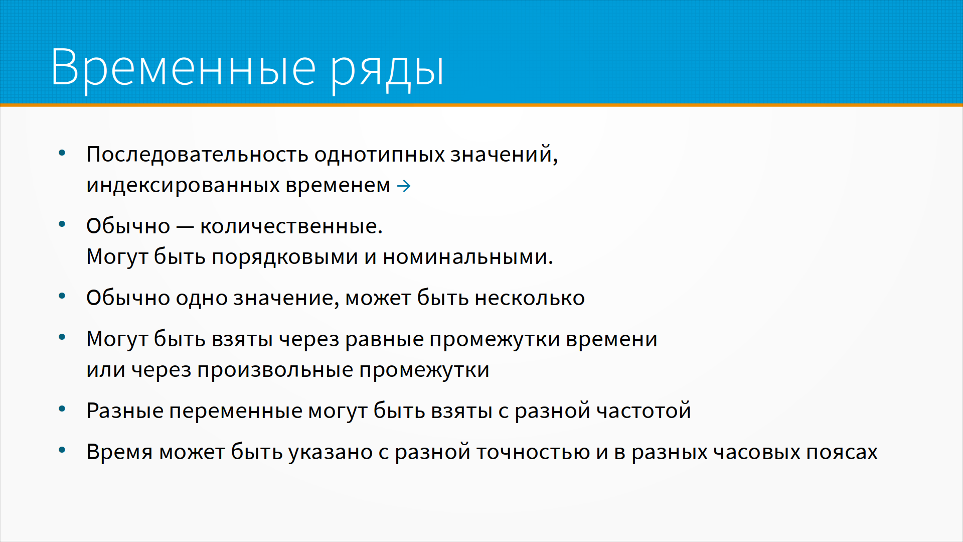 Ну и разные переменные в одних и тех же временных рядах могут быть взяты с разной частотой. Время может быть указано с разной точностью и в разных часовых поясах. Про часовые пояса — это вообще интересный момент, потому что, когда мы строим систему, мы как бы предполагаем, что все временные отметки мы можем сравнивать между собой и все они в одном часовом поясе. Там можно отдельным образом по этому поводу работать, я чуть-чуть попозже приведу примеры.