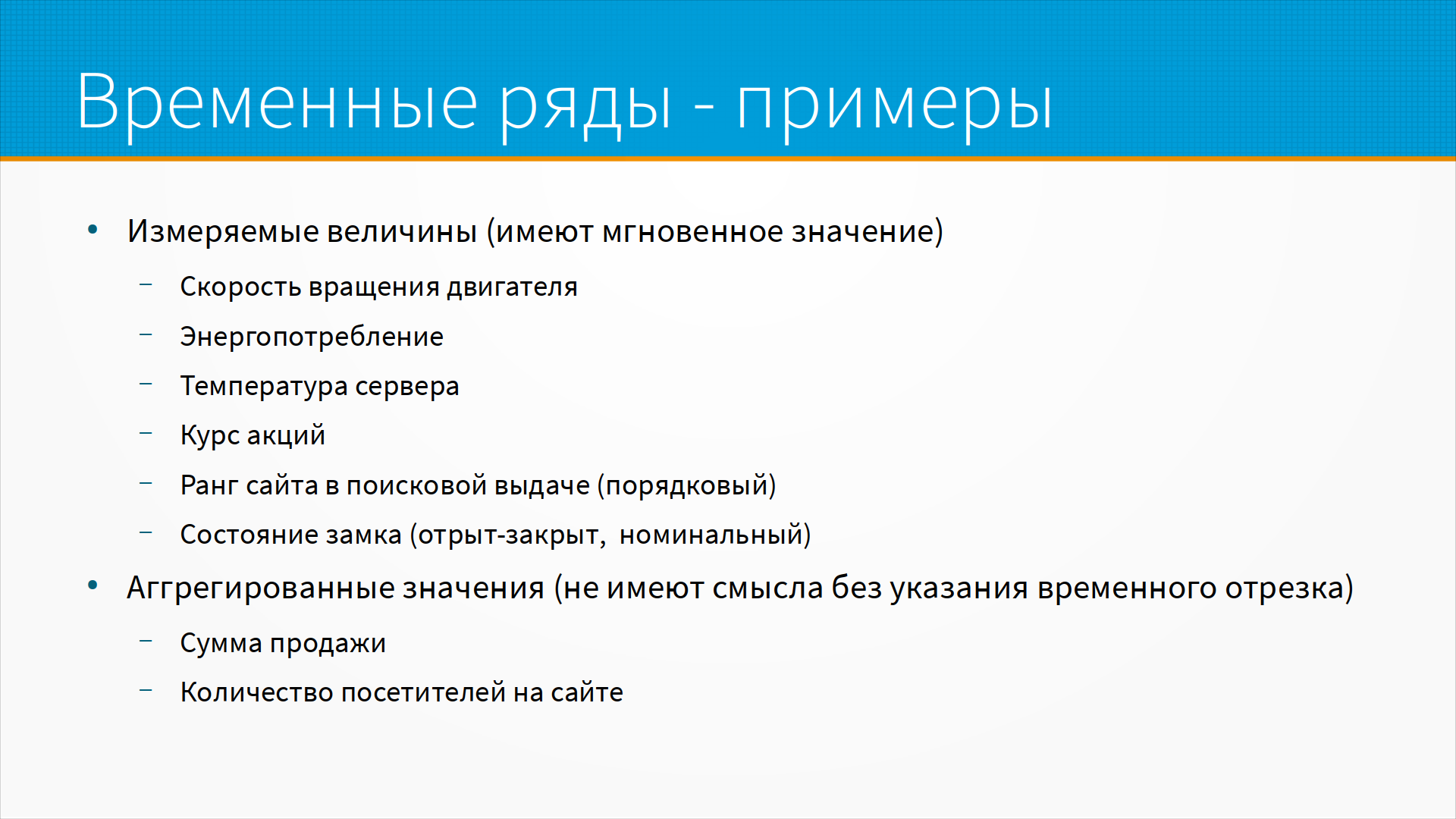 Про временные ряды — какие бывают величины? Например, величины бывают измеряемые, они отличаются тем, что они имеют мгновенное значение, то есть в любой момент мы можем сказать, что моментальное значение величины такое-то. Например, скорость вращения двигателя — в любой момент у нас есть какая-то скорость вращения двигателя. Есть энергопотребление, и, несмотря на то, что его меряют в киловаттах в час, вообще-то говоря, мы можем померить энергопотребление в секунду. Температура сервера в градусах, курс акций. С курсом акций тоже сложно — обычно под курсом акций понимают некоторую усредненную величину между продажей акций или между состоявшимися сделками по продаже или состоящимися сделками по покупке. То есть, курс акций на самом деле сложный агрегат, но можно сказать, что в какой-то конкретный момент для каких-то акций установлен какой-то курс. Ранг сайта в поисковой выдаче — например, у нас сайт был на пятой позиции в поисковой выдаче, стал на третьей. И вот это пример порядковых данных. Понятно, что третья позиция лучше, чем пятая или седьмая, но никаких арифметических операций над ними мы производить не можем.