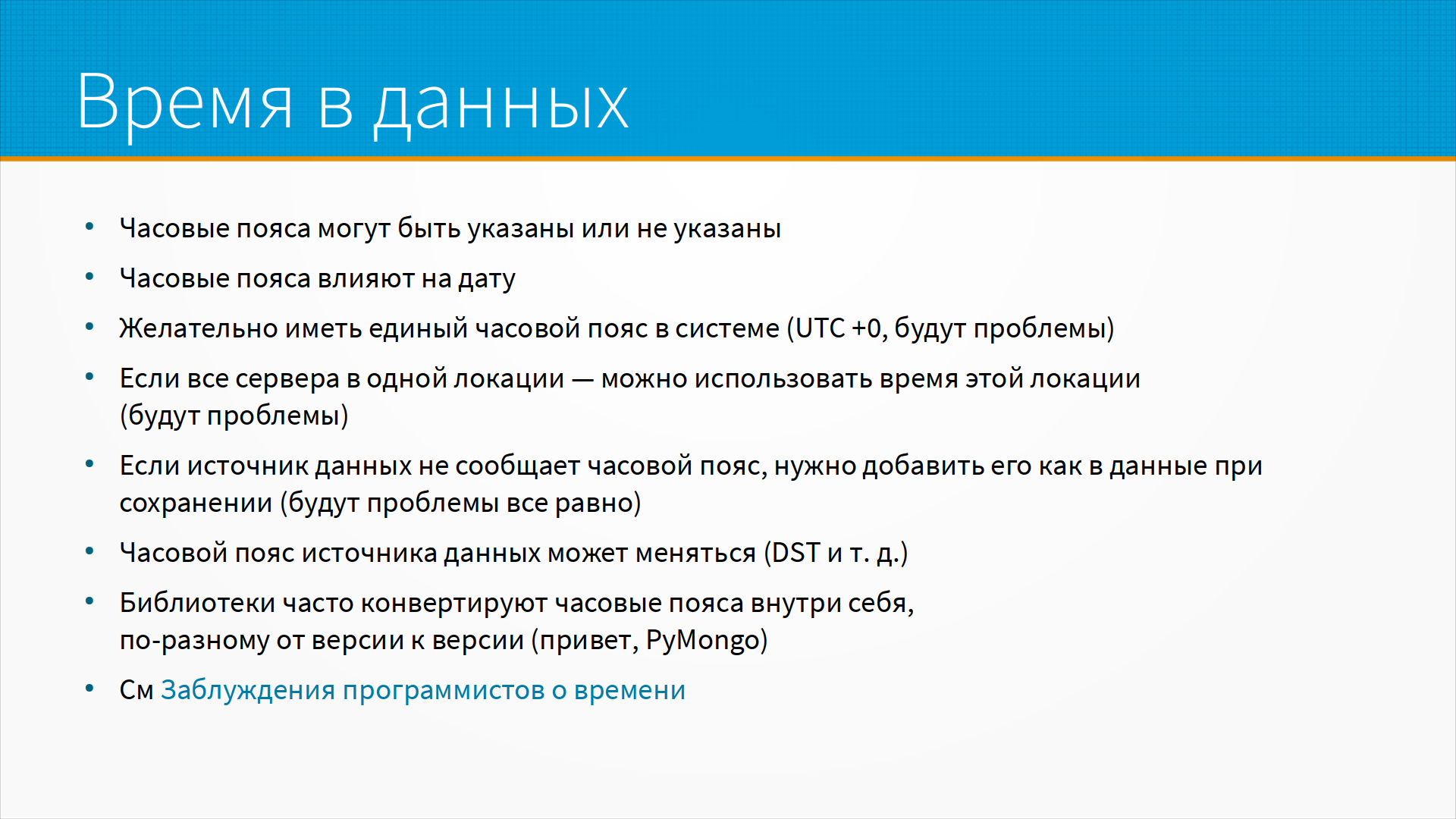 Ну и библиотеки часто конвертируют часовые пояса внутри себя, причем иногда разные версии одной и той же библиотеки делают это по-разному. То есть вы отладили все эти глюки с временем, обновили версию питона, обновили версию pymongo, и у вас время, которое сохранялось в одном часовом поясе, начало сохраняться в другом. В общем, за временем надо следить, нужен глаз да глаз.