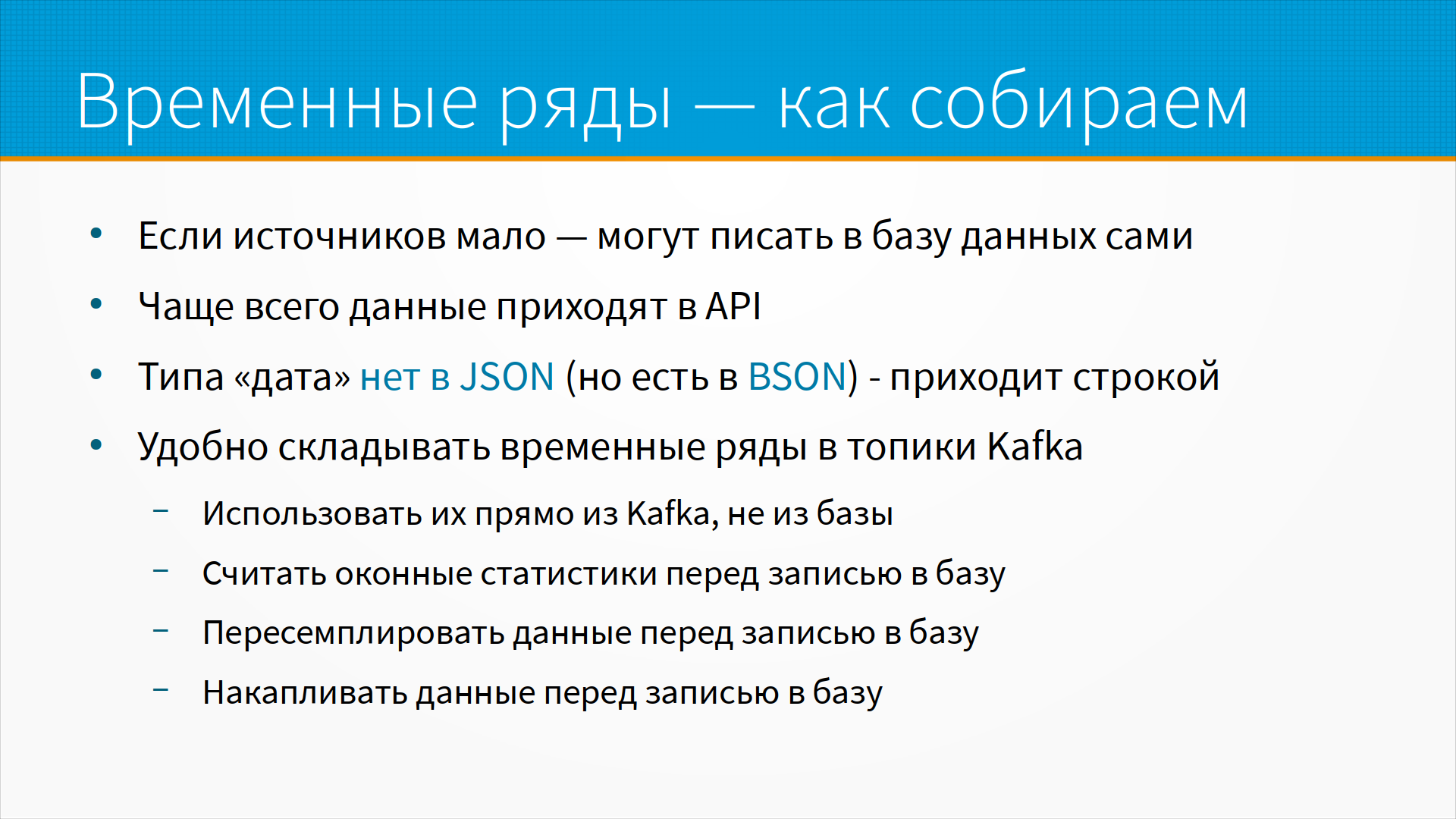 Удобно складывать временные ряды в топики Kafka, о которой мы как-то говорили раньше, и их можно использовать прямо из Kafka, не складывая в базу. То есть мы можем считать какие-то оконные статистики прямо в Kafka до записи в базу. Также из Kafka мы можем пересэмплировать данные перед записью в базу или накапливать данные пакетами.
