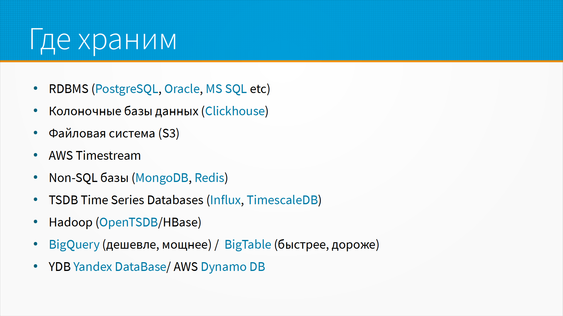 Есть специальная time series база данных, например, Influx, в которой часто хранят статистику собираемой серверов телеметрии, или TimeScaleDB. В Hadoop, когда хранят данные, если у вас есть Hadoop, там есть hbase и поверх нее Open Time Series Database. В случае, если у вас есть Hadoop, наверное, вариантов других и нет. Если вы работаете в инфраструктуре Google, то у вас есть выбор — хранить данные в BigQuery или BigTable. В BigQuery получается несколько дешевле и, на мой вкус, мощнее. Там можно делать ML-модели, которые работают прямо внутри BigQuery. В BigTable она быстрее, но хранение системы, хранение данных получаются дороже. У Яндекса есть Yandex.DataBase, совместимый по API с AWS Dynamo DB амазоновской.