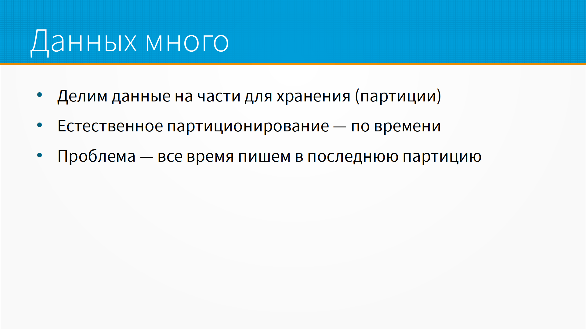 Проблема временных рядов в том, что они поступают все время. То есть, если обычные транзакционные данные у нас поступают, когда стряслось какое-нибудь событие, то временные ряды обычно идут потоком, то есть их много. И нам нужно делить данные на части для хранения. Естественное партиционирование во временных рядах – это партиционирование по времени. То есть, мы, например, сегодняшний день складываем в одну физическую таблицу, вчерашний день – в другую, позавчерашний – в третью. У, например, того же самого ClickHouse мы задаем ключ партиционирования — как раз вот дату. Проблема такого подхода в том, что все новые данные всегда пишутся в самую последнюю партицию. С этим можно бороться отдельным образом, но про это надо просто помнить, что если у вас есть 100 серверов, они партиционированы по времени, то все время на запись у вас будет нагружен только один сервер.