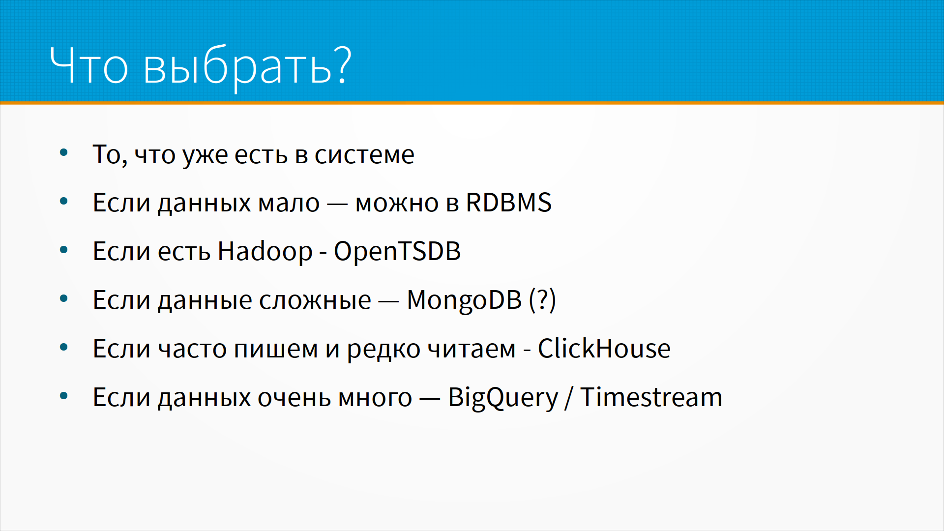 Какой способ хранения временных рядов выбрать? Ну, во-первых, надо выбирать то, что уже есть в системе. То есть, вы уже как-то храните данные, и ваши временные ряды, скорее всего, надо хранить там же, где хранится все остальное. Если данных мало, однозначно храните в реляционной базе данных. Если у вас есть Hadoop, используйте Open Time Series Database. Если данные сложные, то есть, у вас по каждому отсчету не просто пара чисел, а какой-то словарь, причем, может быть, с меняющейся структурой — то есть, сегодня он один, завтра другой, послезавтра третий — то, наверное, MongoDB будет хорошим выбором. Если мы часто пишем данные и редко их читаем, то ClickHouse идеален — он как раз был придуман для хранения временных рядов, кликстримов, статистики, вебсайтов. Если данных очень много, то лучше всего брать что-нибудь облачное, вроде BigQuery или TimeStream.
