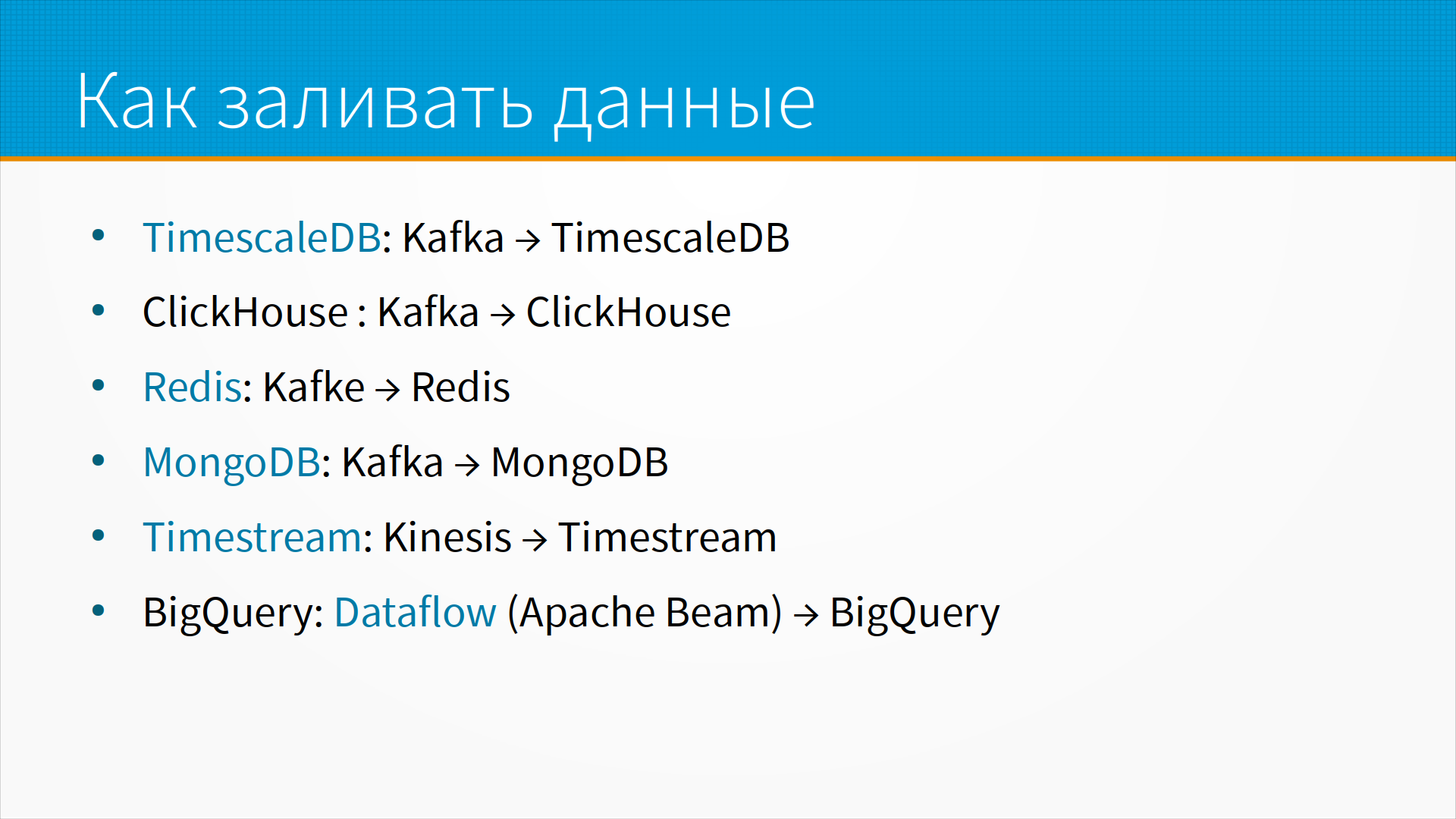 Как мы заливаем туда данные? TimeScaleDB — хороший сценарий: мы льем наши временные ряды в Kafka, а у Kafka есть sink в TimeScaleDB. У ClickHouse та же самая модель — льем данные в Kafka, ClickHouse умеет из sink Kafka забирать. Sink — это то, что стоит на конце конвейера. То есть, если помните, когда мы говорили про Kafka, я сравнивал ее с некоторым конвейером, багажной лентой, по которой движутся ваши чемоданы, и вы ищете в них свой. Так вот, в конце этой багажной ленты стоит так называемый sink, их может быть несколько, который отправляет данные куда-нибудь. Он может просто удалять данные, которые дошли до конца, а может заливать их в базу данных пачками. Есть sink из Kafka в Redis, есть sink из Kafka в MongoDB. Если вы используете TimeStream амазоновский, то естественно использовать Amazon Kinesis — это функционально аналогичная Kafka система, брокер сообщений. Для BigQuery, пожалуй, правильный подход будет — с помощью DataFlow (это Hosted версия Apache Beam) писать в BigQuery.