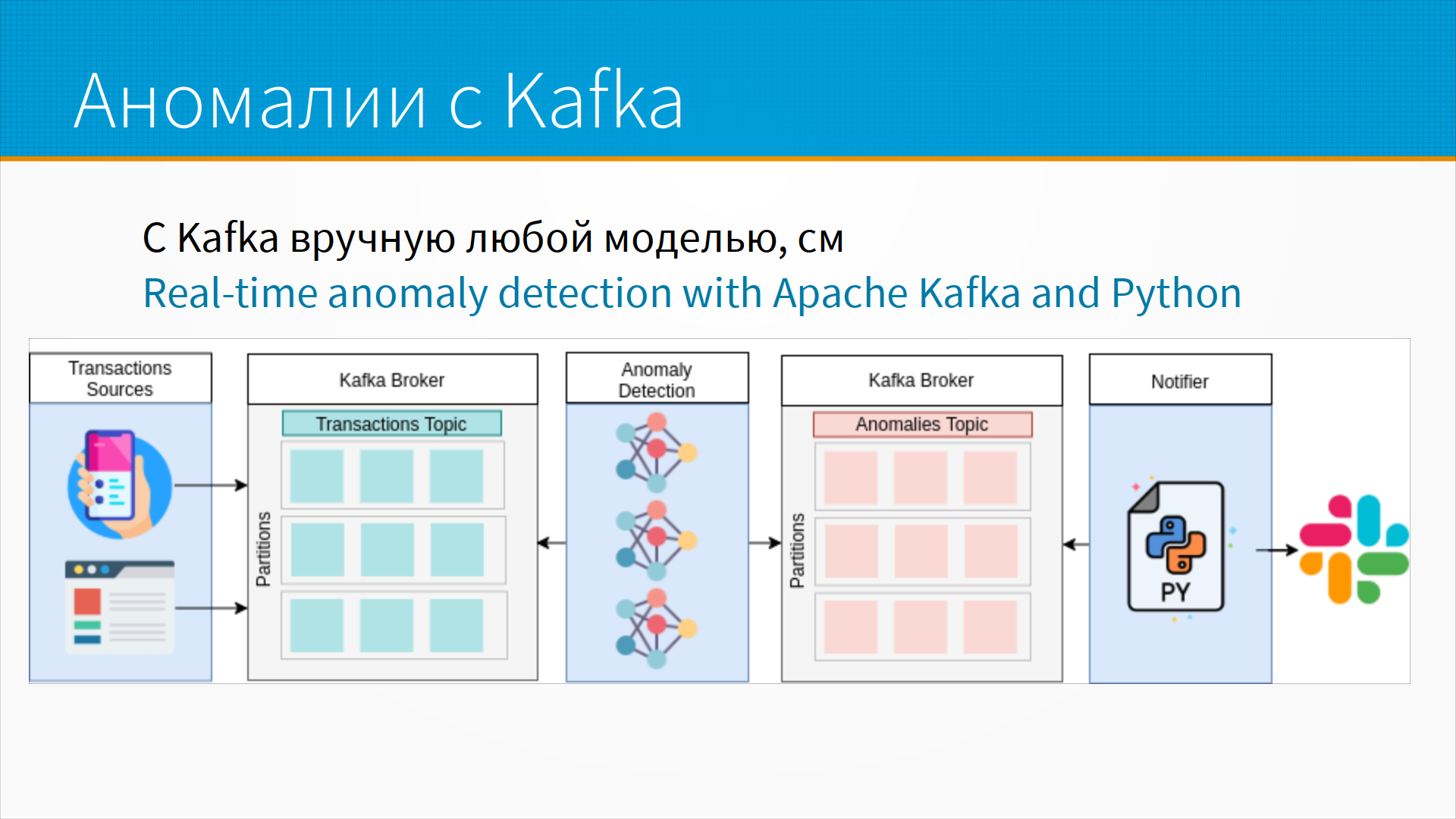 Пример, как мы могли бы обрабатывать временные ряды с Kafka — есть статья про детектирование аномалий, ссылка на слайде. То есть у нас есть некоторый источник транзакций, постоянных во времени операций, есть брокер Kafka, который берет данные из топиков и пишет, наверное, в какую-то базу данных. И тут же прямо из топика — как мы помним, у одного топика может быть несколько подписчиков, — стоит система аномалий, которая, грубо говоря, просматривает проезжающие по багажной ленте чемоданы и ищет, нет ли в них чего-нибудь странного. И, как только аномалия найдена, она ставит сообщение об аномалии в другой топик для аномалий, откуда все заинтересованные лица его заберут, отправят оповещение, сделают еще что-нибудь, предпримут какие-нибудь меры, которые нужно предпринять, когда аномалия детектирована. То есть у нас есть топик, по которому идут исходные данные, и топик, — один или несколько, — в который у нас уходят сюда аномалии, сюда насчитанные статистики и так далее.
