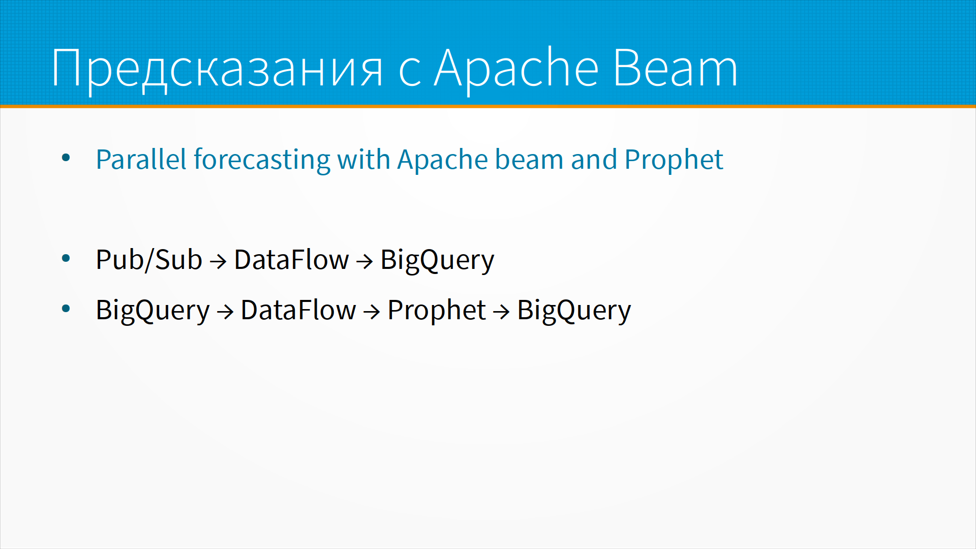 По ссылке на слайде есть разбор того, как можно построить предсказания на временных рядах, которые прямо сейчас льются в нашу систему. То есть с помощью Apache Beam у нас есть два потока. Первый — наши данные льются в Pub/Sub, это брокер сообщений гугловский, попадают в DataFlow, который их сохранит в BigQuery. Это тот самый первый поток с транзакционными данными, прием данных. А дальше, как только данные попали в BigQuery, мы можем в DataFlow написать постоянный запрос, который будет все время подтягивать свежие данные, попавшие в BigQuery. И DataFlow вытаскивает их оттуда, отправляет в библиотеку Prophet, которая выполняет предсказания на временных рядах, и складывает предсказанные обратно в BigQuery. Таким образом, у нас текут в базу данных данные, в наше хранилище BigQuery, и сразу параллельно насчитываются прогнозы, прямо по мере поступления данных.