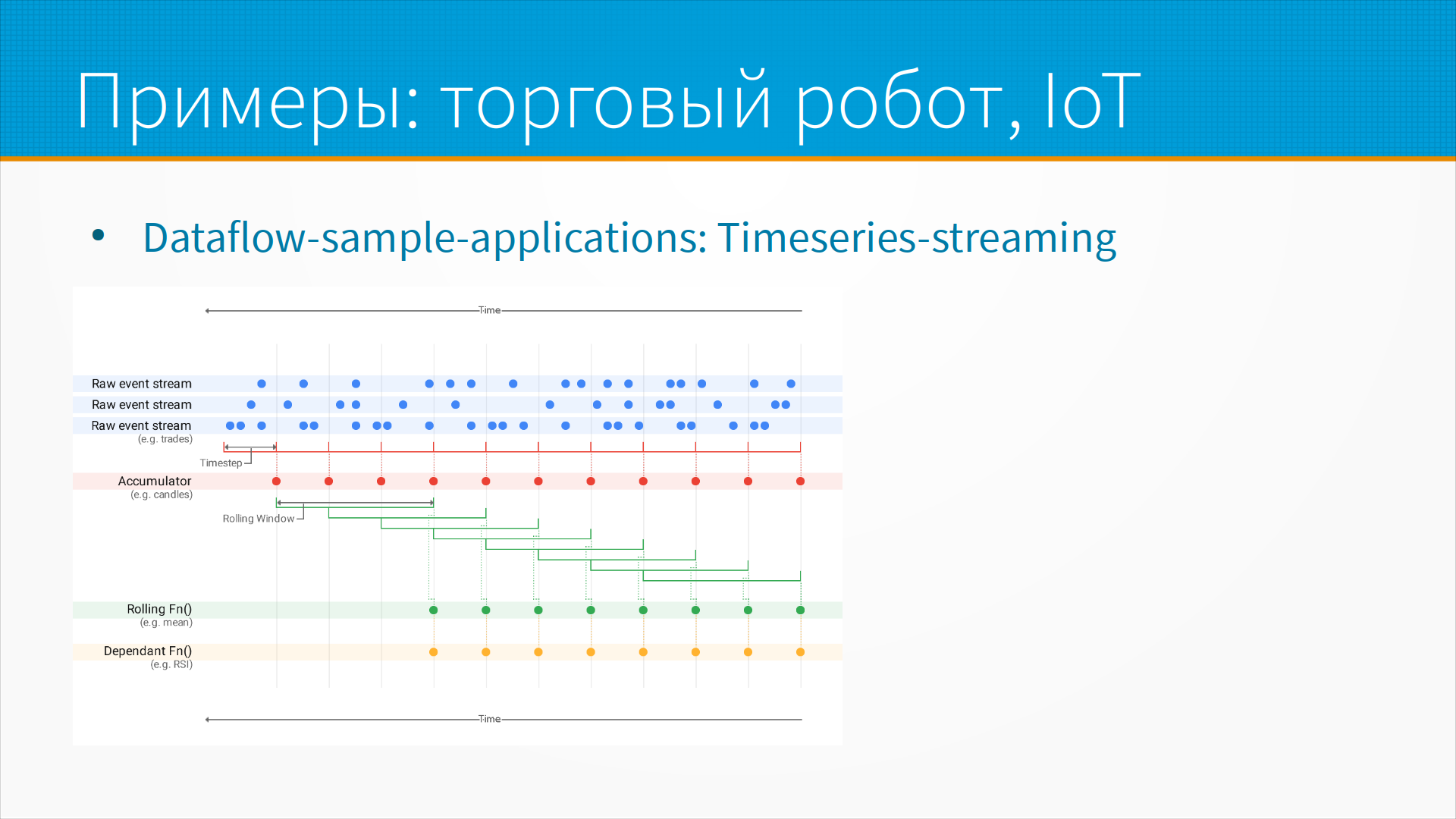 Еще примеры — из документации по DataFlow, Time Series Streaming. Там два примера. Один из них — торговый робот для торговли акциями, а второй — работа с IoT, интернетом вещей, то есть сбором данных с устройств. И вот тут мы видим, что у нас есть некоторые потоки сырых данных. И на этих данных мы насчитываем некоторые агрегирующие значения, то есть это линия аккумулятора. На них же мы насчитываем некоторые скользящие метрики, в данном случае скользящие средние, например, и некоторые производные метрики — то есть мы можем считать некоторые прогнозы, исходя из уже насчитанных наших средних и каких-то аккумуляторов, агрегированных данных. И в результате мы можем либо отдавать какие-то торговые сигналы — то есть продаем, покупаем эти акции, потому что они падают, они растут, либо в случае time series streaming от каких-нибудь датчиков мы можем заполнять пропущенные значения, либо выполнять детектирование аномалий, очистку и так далее.