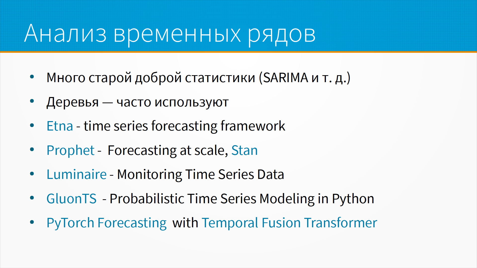 Есть библиотека Luminaire для мониторинга и поиска аномалий во временных рядах. Из библиотек для поиска аномалий во временных рядах это, наверное, самое лучшее. Есть Gluon Time Series — это библиотека для вероятностного моделирования временных рядов на питоне. И сравнительно свежее дополнение в PyTorch Forecasting про Temporal Fusion Transformers, трансформеры для предсказания временных рядов.