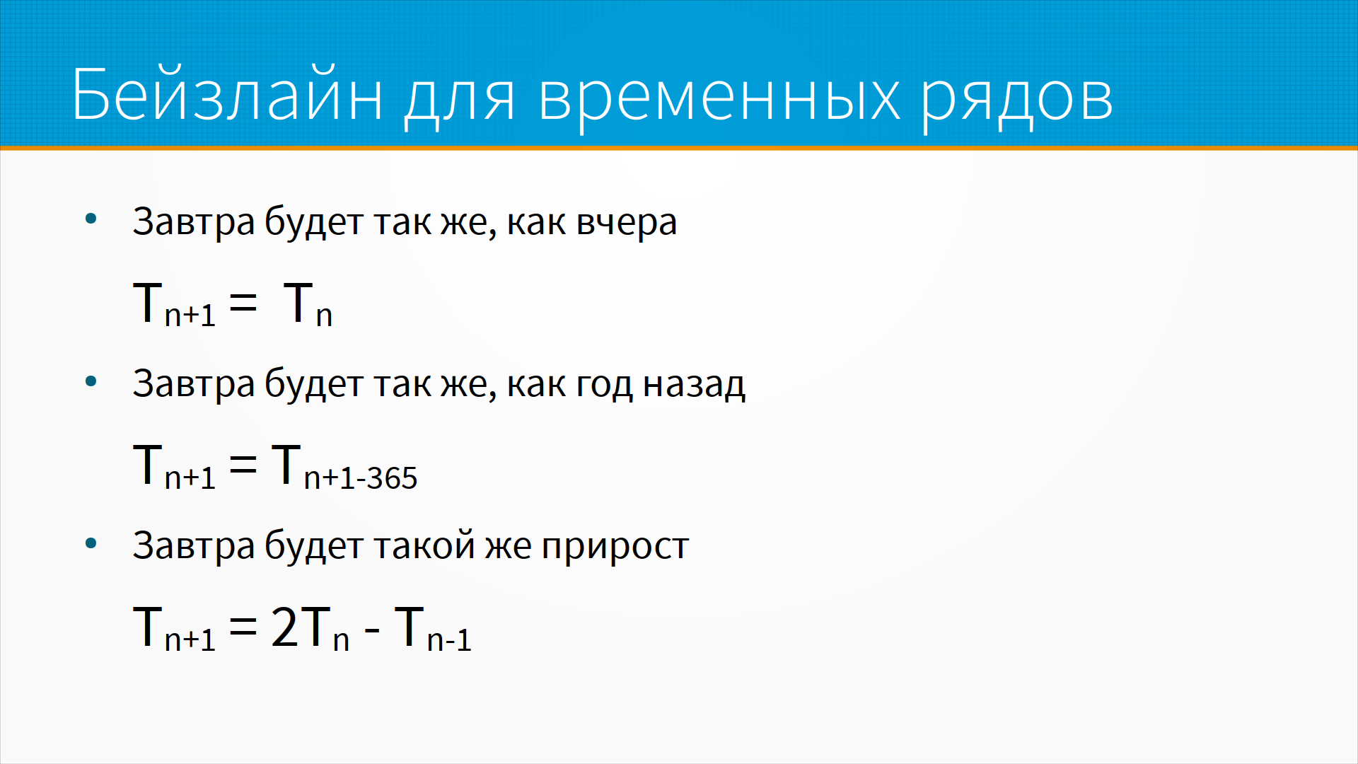 При работе с временными рядами бейзлайны наши обычно очень простые. То есть самый простой и очевидный бейзлайн для временных рядов — "завтра будет так же, как вчера". Несколько более сложный — в тех случаях, когда у нас есть какая нибудь выраженная сезонность — это "завтра будет так же, как год назад", или "завтра будет так же, как в такой же день недели на прошлой неделе". Или "завтра будет такой же прирост" — то есть позавчера мы продали 10 шоколадок, вчера мы продали 15 шоколадок, сегодня мы продали 20 шоколадок, а завтра, наверное, продадим 25. У этого подхода, очевидно, есть ограничения, то есть, когда нибудь он перестанет работать, но в определенных пределах он работает. И еще хороший бейзлайн, тут его на слайде нет, это скользящее среднее. То есть "завтра будет так же, как в среднем было за последние 7 дней", или 7 дней с поправкой на сезонность по дням недели.