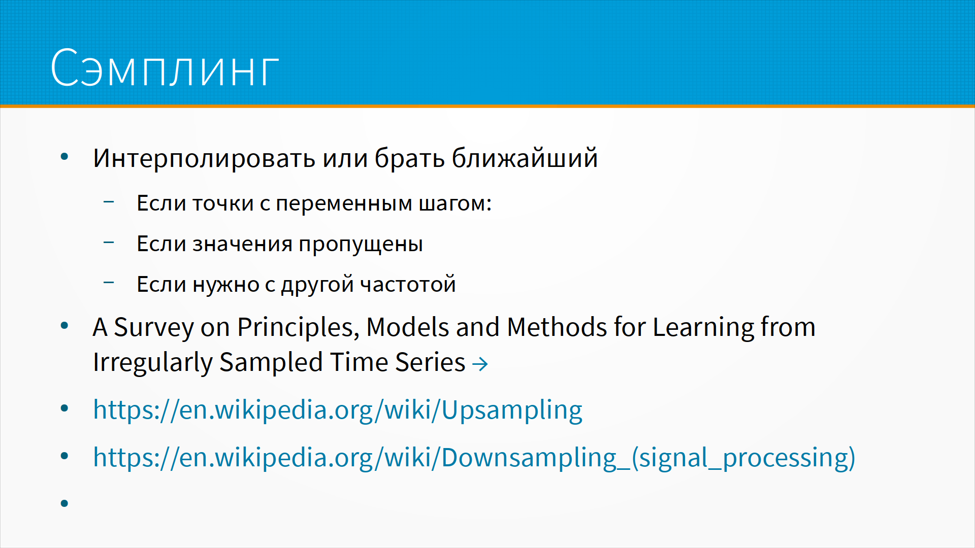 Зачастую точки бывают с переменным шагом, и тогда нам нужно их пересэмплировать, тоже взять среднее какое-нибудь. Если значения пропущены, мы можем взять среднее или интерполировать. Есть хороший обзор про работу с нерегулярно сэмплированными временными рядами. Но надо заметить, что мы же много лет работали с обработкой сигналов, в которых upsampling и downsampling, скажем, в работе со звуком — это совершенно нормальные явления. И наши time series в этом смысле — точно такой же сигнал, с которым также можно делать upsampling и downsampling. Тут ссылки на статью в Википедии, где разобраны эти подходы.