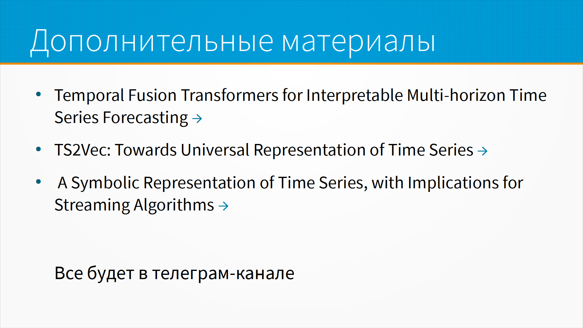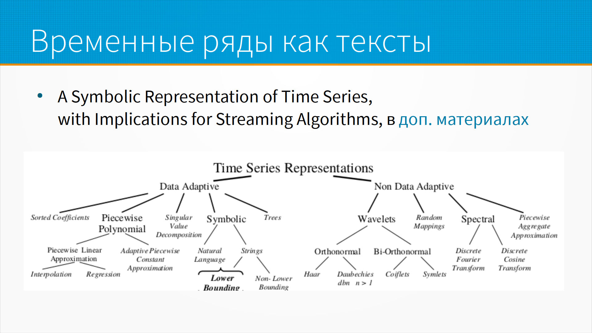 Временные ряды можно представлять как тексты. Звучит немножко странно, но предположим, что у нас есть курс акции, допустим, и мы его представляем, вот эти телодвижения, которые происходят с курсом акции, как слова — например, "сильно выросло", "слабо выросло", "стоит на месте". А потом учим, например, языковую модель или какой-нибудь анализ тональности или что-нибудь еще. И есть старая статья, она есть в дополнительных материалах, про разные подходы к представлению данных во временных рядах. Несмотря на странность этого подхода, когда мы представляем временные ряды или какие-то последовательности транзакций как тексты, у Воронцова, допустим, аспиранты из его BigARTM очень много делали таких предсказаний — брали модель, предназначенную для текстов, и с ее помощью анализировали музыкальное предпочтение в плейлистах, или какую-то аналитику делали поверх финансовых транзакций.