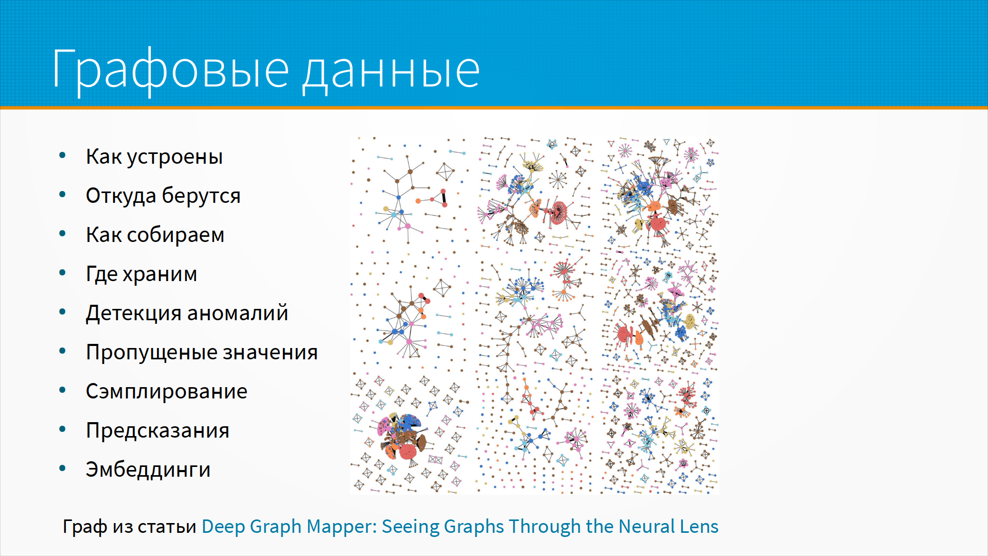 Кроме временных рядов, к странным данным я отнес бы графовые данные. Графовые данные – это некоторые данные, описывающие отношения между сущностями. То есть у нас в обычных табличных данных есть какая-то сущность и ее атрибуты. А в графовых данных у нас отношения между несколькими сущностями, например, между двумя.
