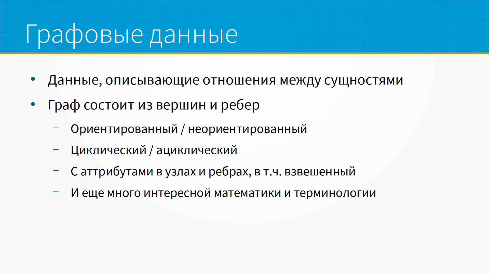 Граф состоит из вершин и ребер. Он может быть ориентированный или неориентированный, то есть у нас может быть симметричное или несимметричное отношение между сущностями. Он может иметь циклы или не иметь. Он может быть взвешенный — в частном случае, это когда у нас на связи между сущностями к ним приписано какое-нибудь число. Например, я люблю яблоки сильнее, чем, допустим, апельсины, а груши сильнее, чем яблоки. И вот на графе между мной и грушей, там, скажем, меньше вес, а, допустим, на яблоке больше вес. Но это частный случай каких-нибудь атрибутов в узлах и ребрах, то есть атрибуты могут быть в узлах графа, а могут быть в ребрах графа. И, в принципе, про графы много есть интересной математики и терминологии.