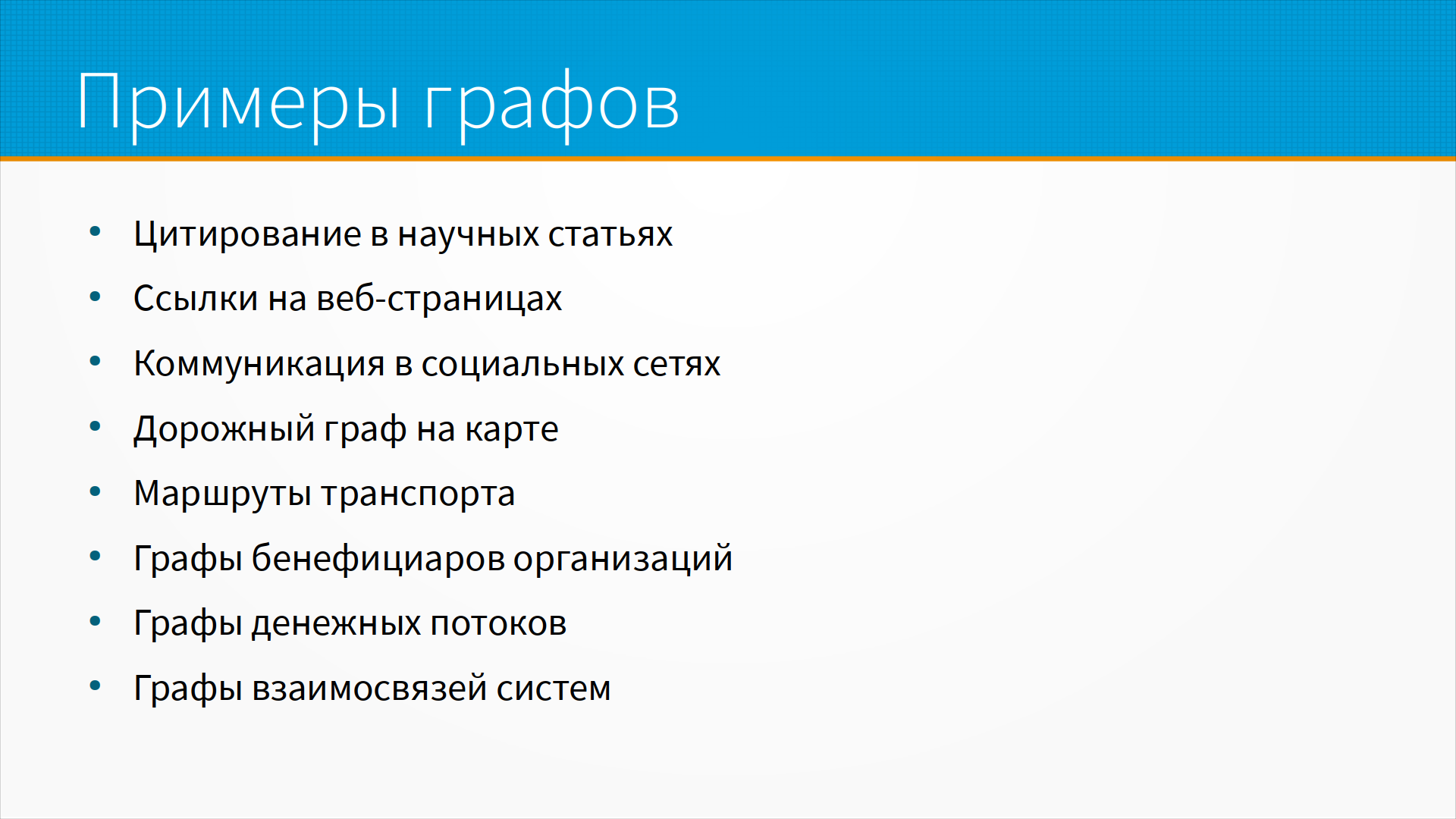 У нас тут не про графы лекция, но примеры практических графов, которые приходилось анализировать — это, например, цитирование в научных статьях. Некоторые научные статьи ссылаются на другие научные статьи, и вот у нас направленный граф.