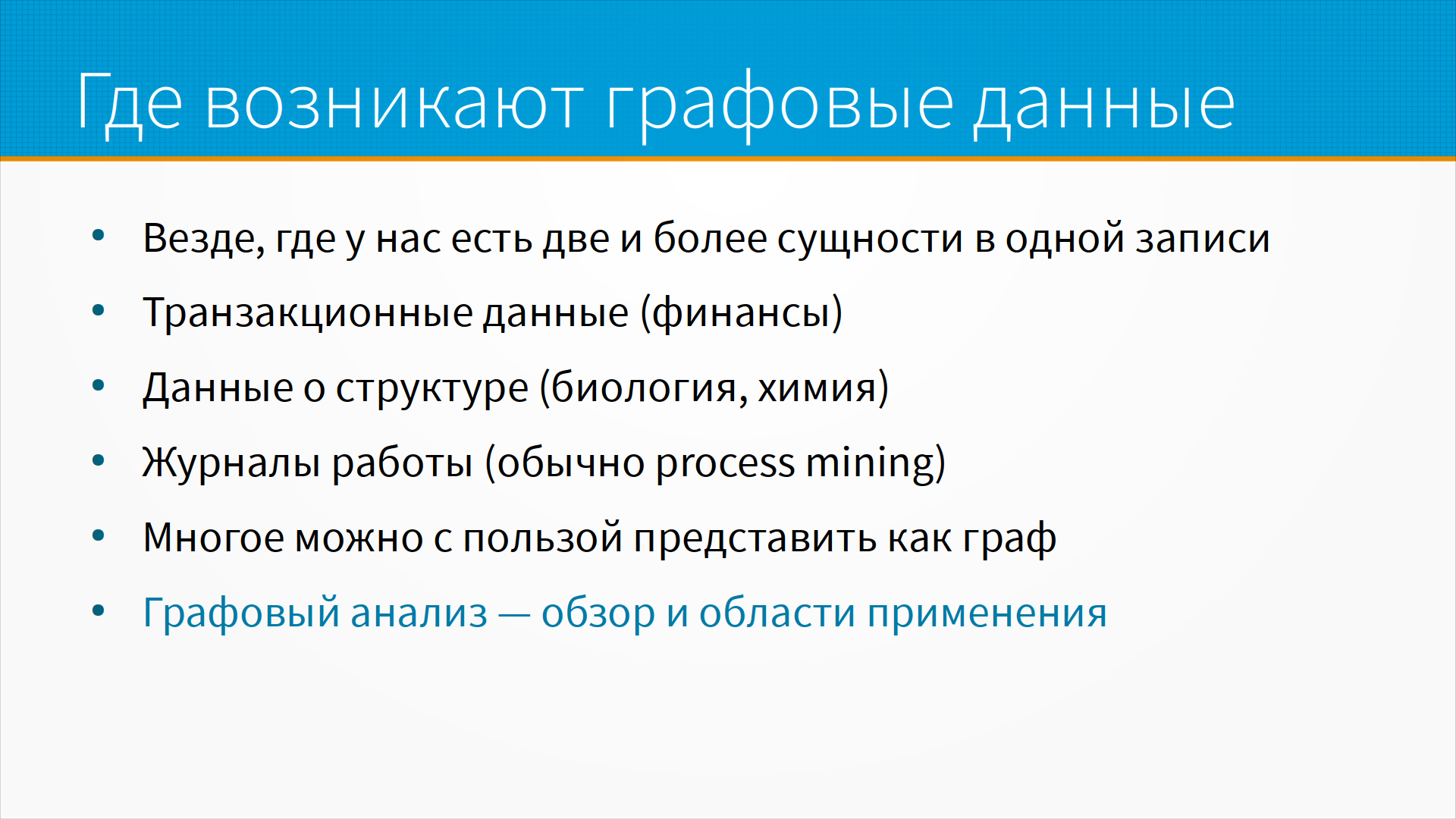 Где возникают графовые данные? Везде, где у нас есть две и более сущностей в одной записи — клиент купил товар, организация заплатила другой организации, то есть это транзакционные данные — финансы, это данные структуры — биология, химия, это журналы работы — то есть, например, больной пришел на прием к врачу, в регистратуре его записали к терапевту, терапевт его записал к невропатологу, и мы можем представить путь больного по врачам, как путешествие больного по некоторому графу, маршруту.