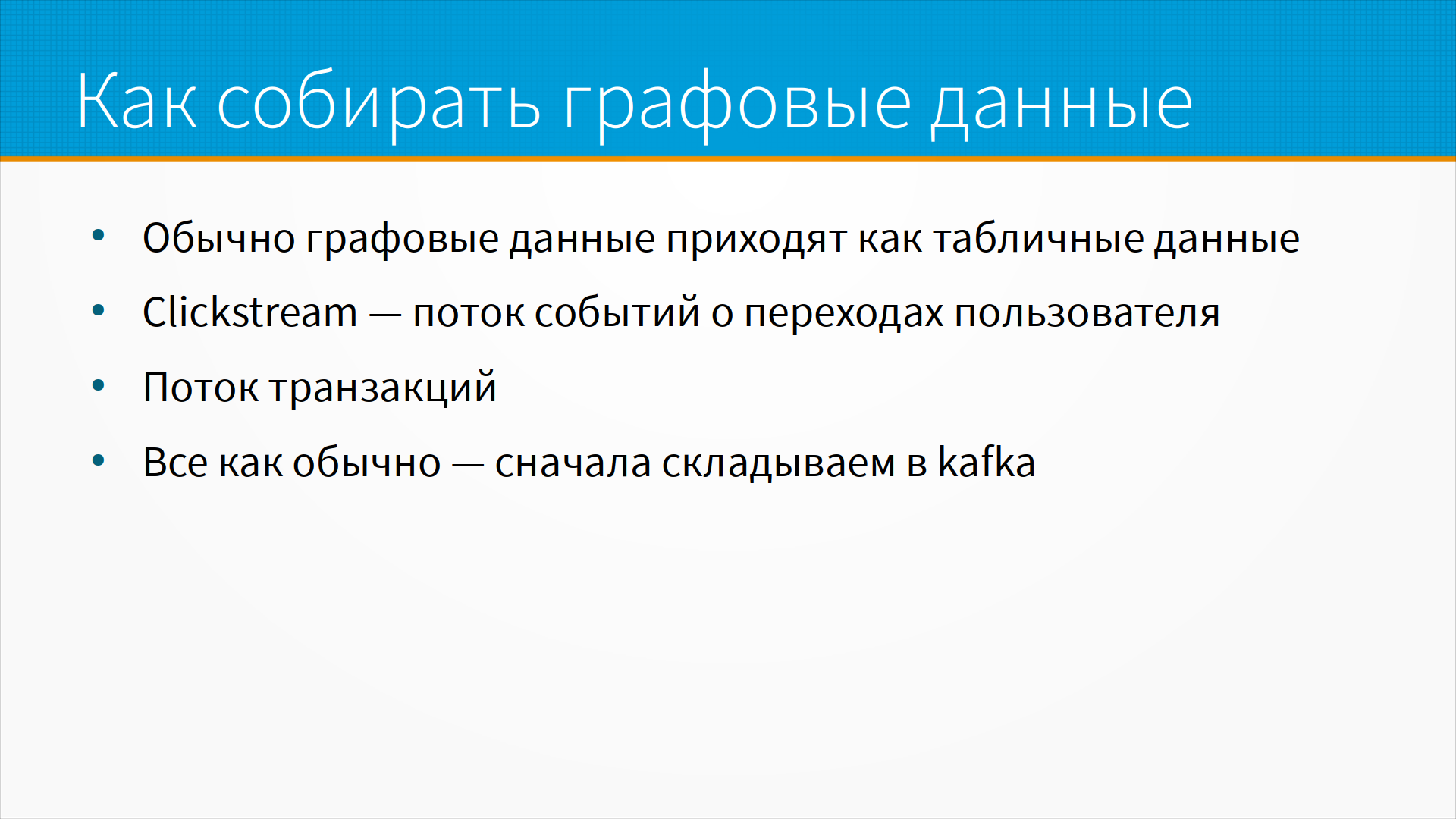 Как собирать графовые данные? Обычно графовые данные приходят как табличные данные, то есть в сборе они выглядят как таблички. Например, кликстрим, поток событий о переходах пользователей. Данные могут приходить в виде кликстрима, могут приходить в виде потока транзакций. Как правило, в большой системе мы их все сначала складываем в Kafka или в Kinesis или в какой-нибудь аналог.