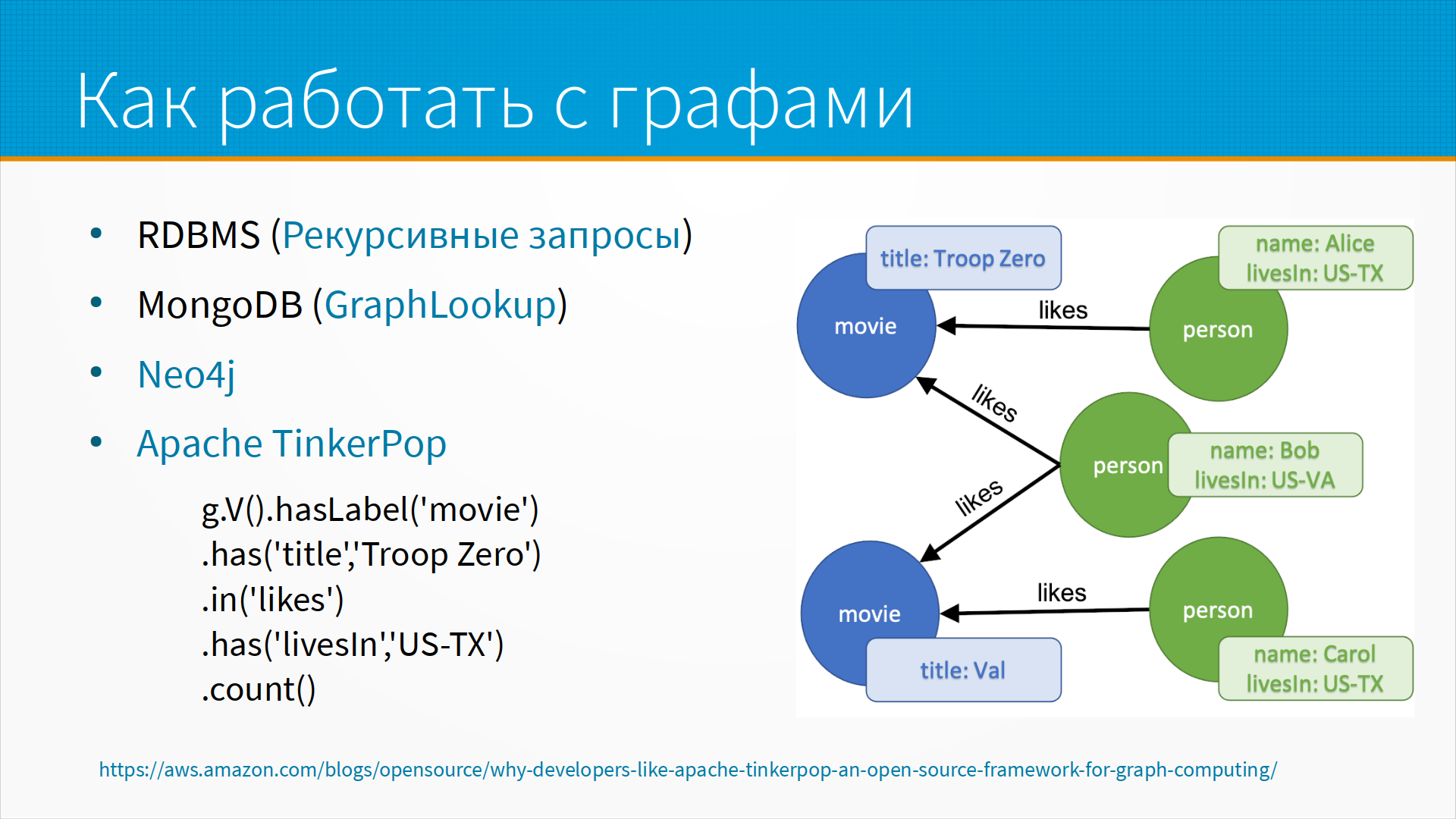 Есть Apache TinkerPop, такая графовая база данных, и она позволяет работать с большими объемами графовых данных более-менее прилично. Например, тут у нас есть граф из людей и фильмов, то есть есть у нас два кинофильма, Val и Troop Zero, и три пользователя — Алиса, живущая в Техасе, Боб, живущий в Вайоминге, и Кэрол, тоже живущая в Техасе. И нас интересует, много ли людей, живущих в Техасе, любят фильм Troop Zero, понравился ли им фильм. И мы выполняем следующий графовый запрос — ко всем объектам нашей базы данных, к узлам базы данных, которые имеют метку, что это фильм, то есть мы отбираем только синенькие кружочки в данном случае, которые имеют атрибут названия Troop Zero, у нас останется один синенький кружочек, находится в отношении likes с некоторыми узлами, у которых есть атрибут "живут в США в Техасе". И count, посчитать количество — то есть это вот пример графового запроса, который позволяет достаточно сложные вещи вытаскивать из графовой базы данных.