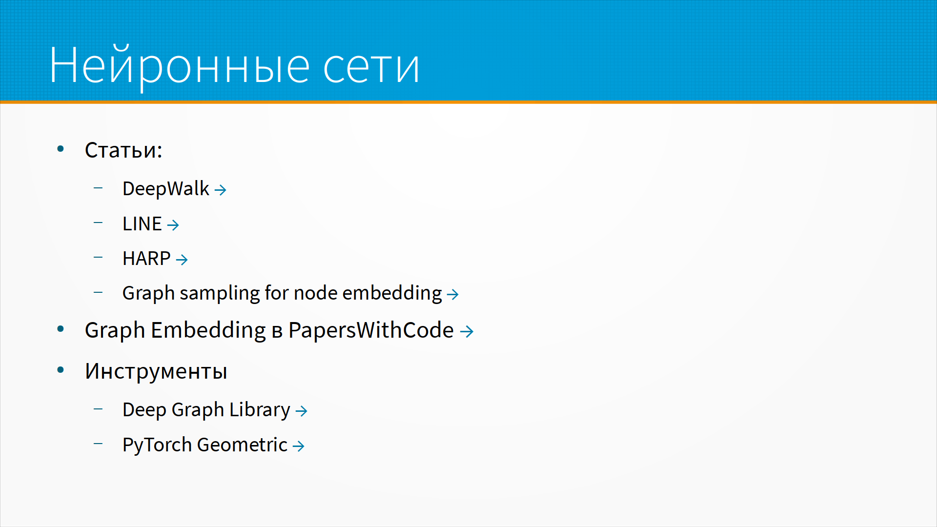 В PapersWithCode есть отдельный раздел про граф-эмбеддинги и пара хороших инструментов, это Deep Graph Library, она более-менее tool agnostic, то есть, она может работать как с Pytorch, так с TensorFlow, MXNet, это библиотека для графовых операций, для работы с графами, с графовыми данными. И есть отдельно Pytorch Geometric, которая хорошо позволяет работать с графами, новая библиотека, очень мне нравится.