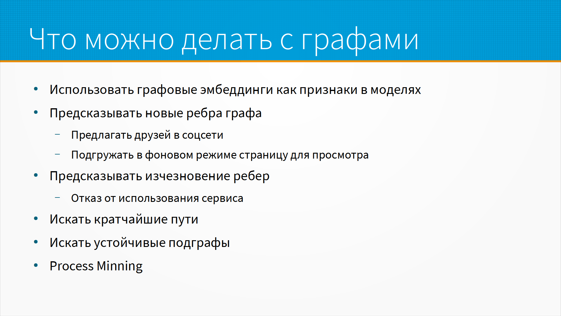 Что можно делать с графами? Во-первых, можно использовать графовые эмбеддинги как признаки в моделях. То есть, мы, допустим, насчитали для каждого узла некоторые эмбеддинги, и потом мы можем говорить, что — ага, это инфлюенсер, а это просто пользователь, это коррупционер, а это честный чиновник, это отмывание денег, а это нормальная хорошая операция. Мы можем предсказывать новые ребра графа, то есть, новые ребра графа в случае соцсетей — это, допустим, предсказание связи, что вы могли бы подружиться с вот этим человеком, возможно, вас заинтересует подписка на вот этого пользователя.