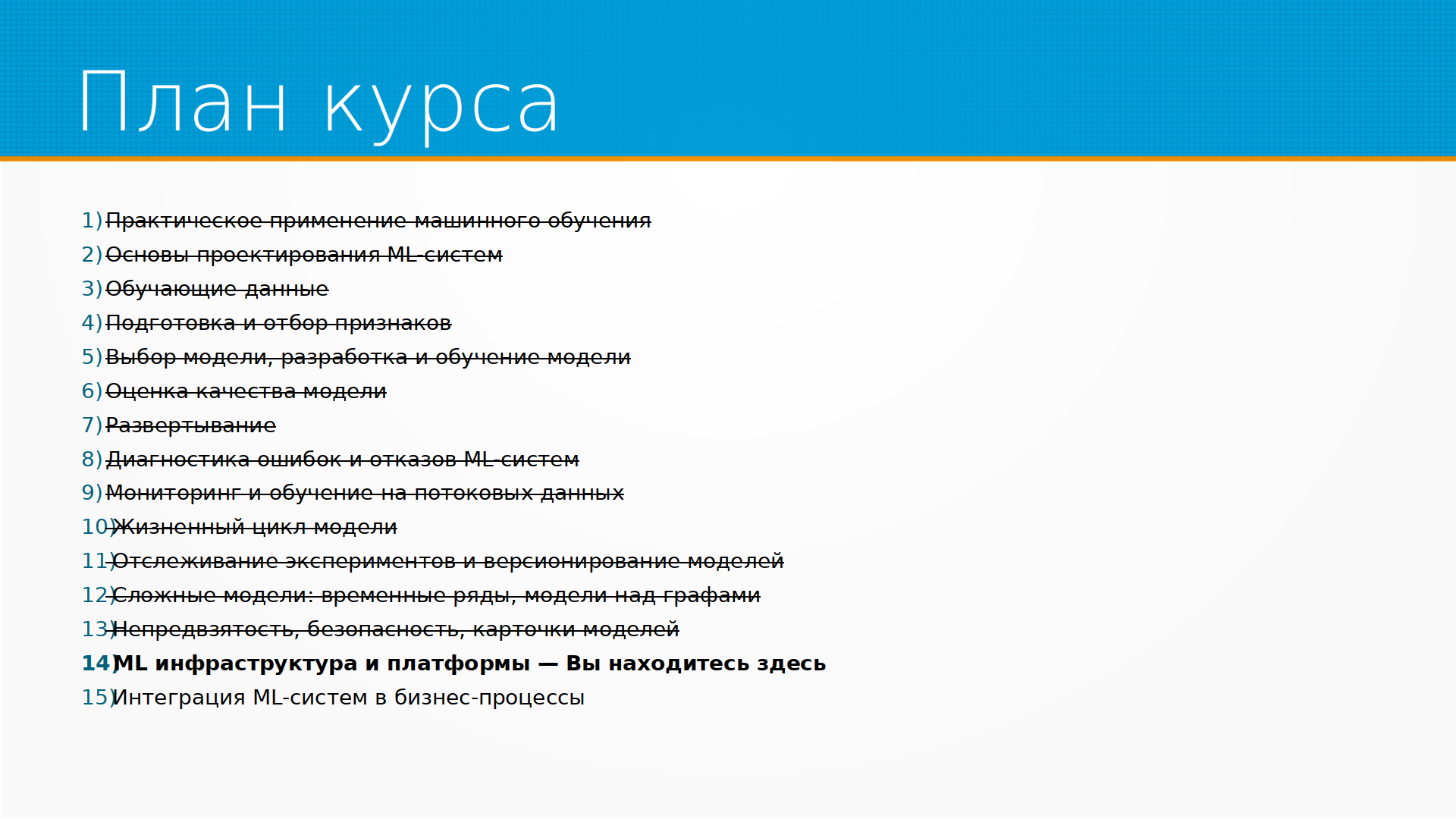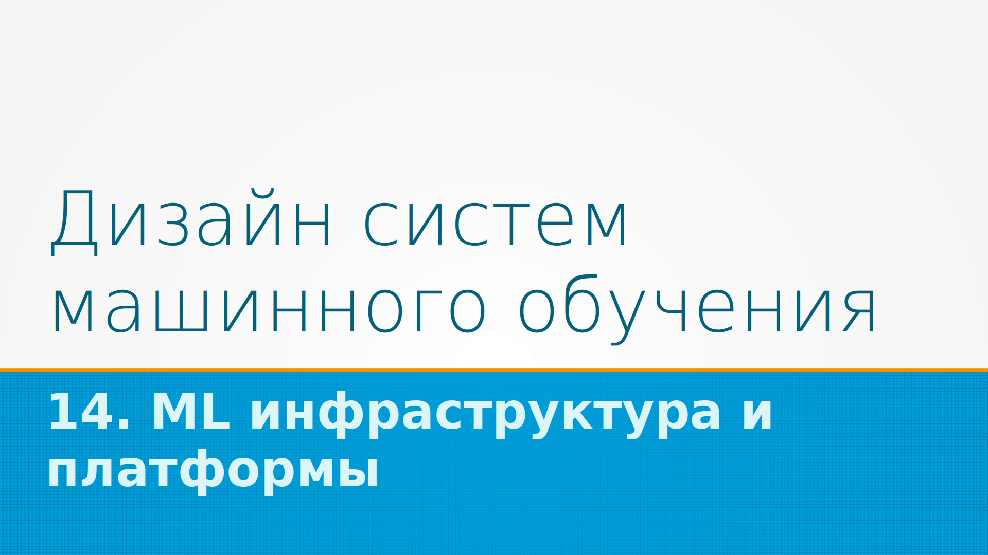 Добрый день. Сегодня у нас 14 лекция курса "Дизайн систем машинного обучения" — про ML-инфраструктуру и платформы.