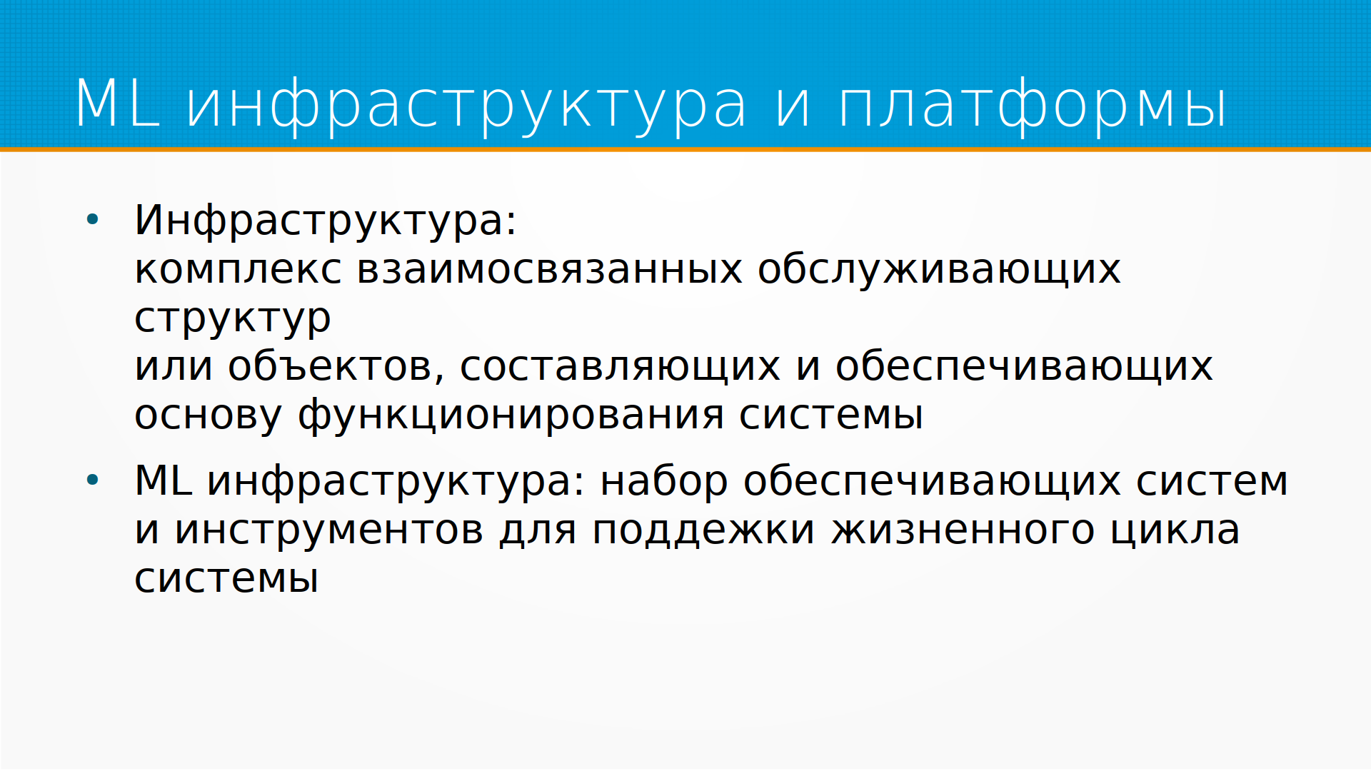 Что такое инфраструктура? Инфраструктура в Википедии определяется как комплекс взаимосвязанных обслуживающих структур или объектов, составляющих и обеспечивающих основу функционирования системы. Можно сказать, что ML-инфраструктура — это набор обеспечивающих систем и инструментов для поддержки жизненного цикла системы.