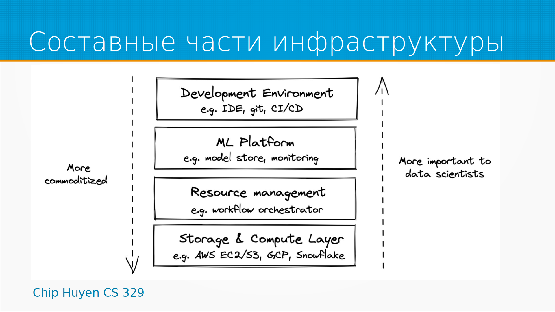 Мы можем думать об инфраструктуре как о некотором многослойном окружении, в котором наша модель существует и развивается. В этом окружении можно выделить слой вычислительный, слой хранения, это Amazon Storage, Google Storage, Яндекс.Диск и так далее. Есть слой управления вычислительными ресурсами и хранением данных. Есть ML-платформы, в которых мы храним наши модели, и испольуем их для развертывания и мониторинга. Есть некоторая среда разработки, jupyter ноутбуки, git, pycharm, IDE, CI/CD и так далее. Чем выше в этой пирамиде, тем мы ближе к дата-саентисту и тем более уникальные части инфраструктуры у нас есть. Каждый настраивает инструмент под себя. Ближе к вычислительным платформам у нас все становится более и более одинаково. Облачное хранилище примерно одно и то же у всех провайдеров.