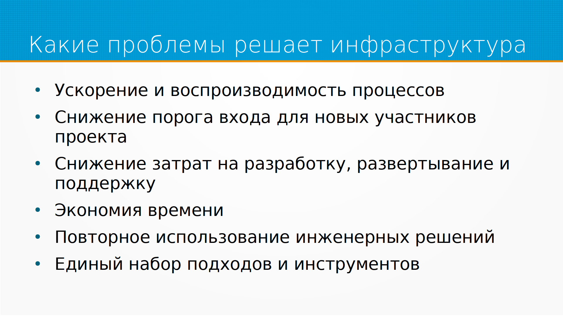 Какие проблемы решает инфраструктура? Почему мы вообще о ней говорим и думаем? Во-первых, инфраструктура позволяет ускорить и обеспечить воспроизводимость процессов. То есть, если у нас есть готовый, пайплайн выкатки моделей, новому разработчику не нужно выучивать все это, у нас снижается порог входа. Мы просто ему даем кнопку, он на нее нажимает и предположительно безошибочно и воспроизводимо, то есть, каждый раз одинаково, происходит выкатка. Тем самым мы снижаем затраты на разработку, на развертывание и поддержку. У нас большая экономия времени, а значит, и денег. Мы повторно используем инженерные решения — наша команда меньше изобретает велосипедов. И у нас есть некоторый единый набор подходов и инструментов, которые мы можем совершенствовать, и он сам по себе начинает являться полезным имуществом нашей организации.
