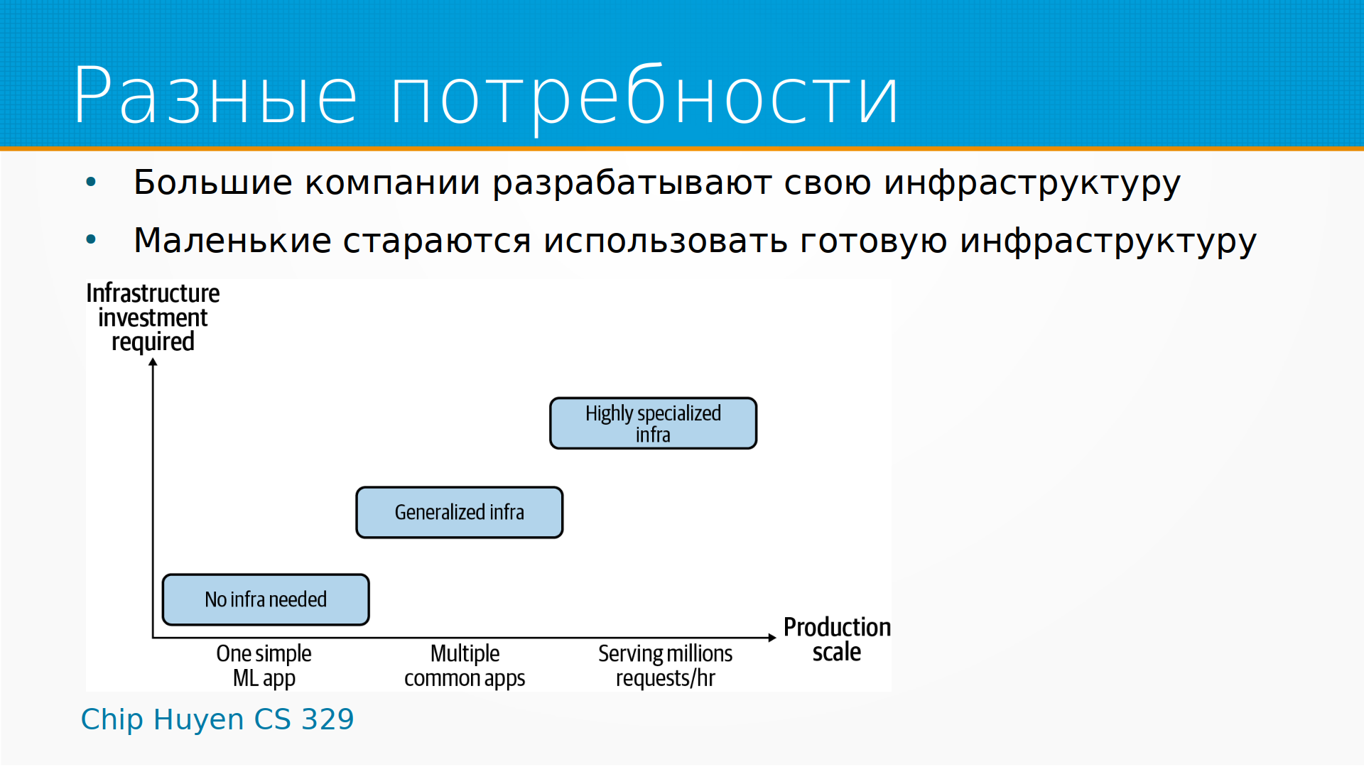 Маленькие компании стараются использовать готовую инфраструктуру. И в зависимости от размера организации, от количества моделей, есть выбор между полностью готовой инфраструктурой и высокоспециализированной инфраструктурой. Большинство организаций, с которыми нам предстоит столкнуться, где-то посередине.