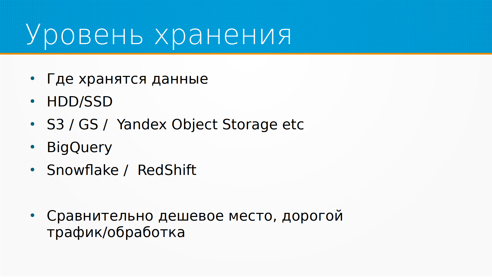 Все начинается с уровня хранения — где, собственно, хранятся данные? В конечном итоге, данные обычно хранятся на жестких дисках или SSD-дисках. Вообще-то, они могут храниться на стримерах. И это интересный пример, потому что мы думаем о данных, доступных в цифровой форме, как о данных, к которым мы обратились, и они сразу у нас появились. Но может случиться так, что данные у нас в каком-нибудь холодном хранилище, и, когда мы через API запросили эти данные, где-то там поехал робот на тележке, достал кассету из хранилища, физически кассету вставил в стример. И время от момента, когда мы захотели данные получить, до момента, когда данные мы получаем, может составить секунды или даже часы. Какие-то данные нам могут быть доступны через 6-8 часов после того, как мы захотели ими воспользоваться. И, например, у Амазона это разные классы хранилищ. У Яндекса, кстати, тоже есть.