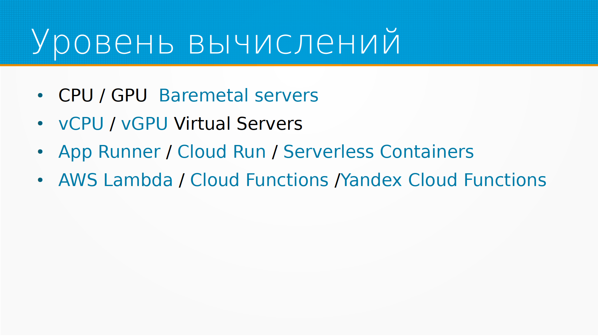 Выше над уровнем хранения у нас есть уровень вычислений. И разнообразие тут очень велико. Можно выделить слои непосредственно Baremetal servers, то есть когда у нас есть что-то, что можно потрогать рукой. У нас есть центральный процессор CPU, у нас есть видеоускорители GPU, и мы физически к этому серверу имеем доступ. Это сервер. Он стоит либо у нас, либо он стоит в colocation, в стойке провайдера. Но так или иначе — когда в нем сгорает жесткий диск, это наша проблема, мы едем и меняем его.