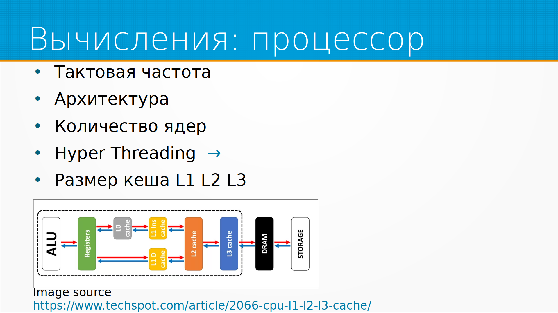 Под капотом всех этих вычислительных мощностей лежит процессор. У процессора есть свои характеристики, такие как, например, тактовая частота, о которой мы думаем — чем быстрее тактовая частота, тем в принципе быстрее работает процессор. Хотя тут есть свои хитрости — например, очень многие процессоры снижают тактовую частоту, чтобы экономить электроэнергию, и у вас на процессоре написано, допустим, 2.6 ГГц, он реально работает на 500 МГц, просто чтобы ему было прохладно.