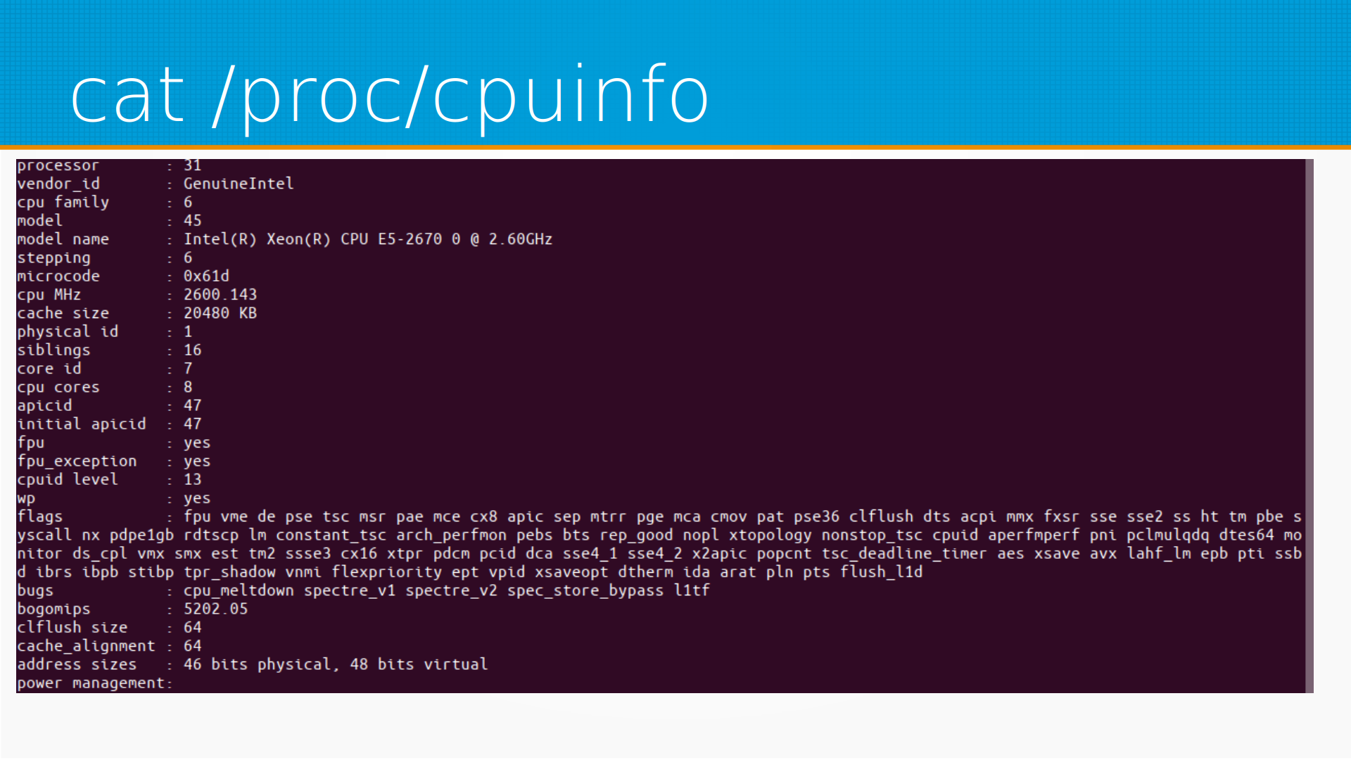 Еще мы можем посмотреть флаги процессора. То есть у каждого процессора есть какие-то наборы команд, которые он поддерживает, и на самом деле у каждого поколения процессоров они разные. Тут еще, например, есть bogomips — это условная производительность процессора в, общем, попугаях. Чем она больше, тем он быстрее. Трудно это во что-нибудь серьезное отобразить. В данном случае — вот это серверный Xeon, 16-ядерные процессоры, и тут мы видим его флаги.