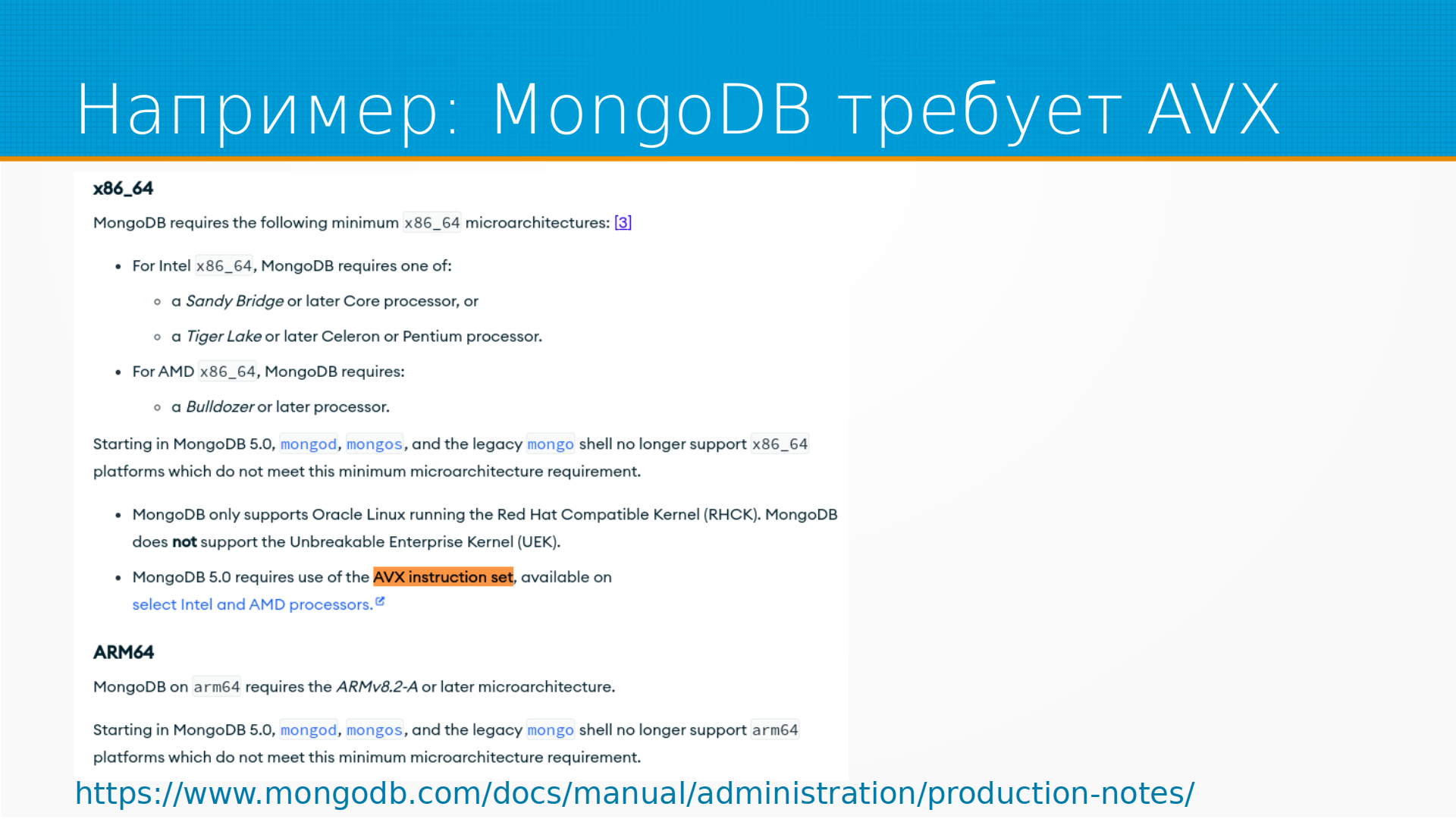 И вот что интересно — до сих пор можно столкнуться с тем, что, допустим, MongoDB требует флаг AVX. Казалось бы, уже 10 лет у всех процессоров этот набор инструкций поддерживается, но нет. Мы лично у заказчика этой весной на эту граблю наступили. Живой, вполне рабочий сервер, MongoDB обновляли с 4.6 на 5.0 — и оно перестало работать, потому что на этих серверах не было AVX Instruction Set.