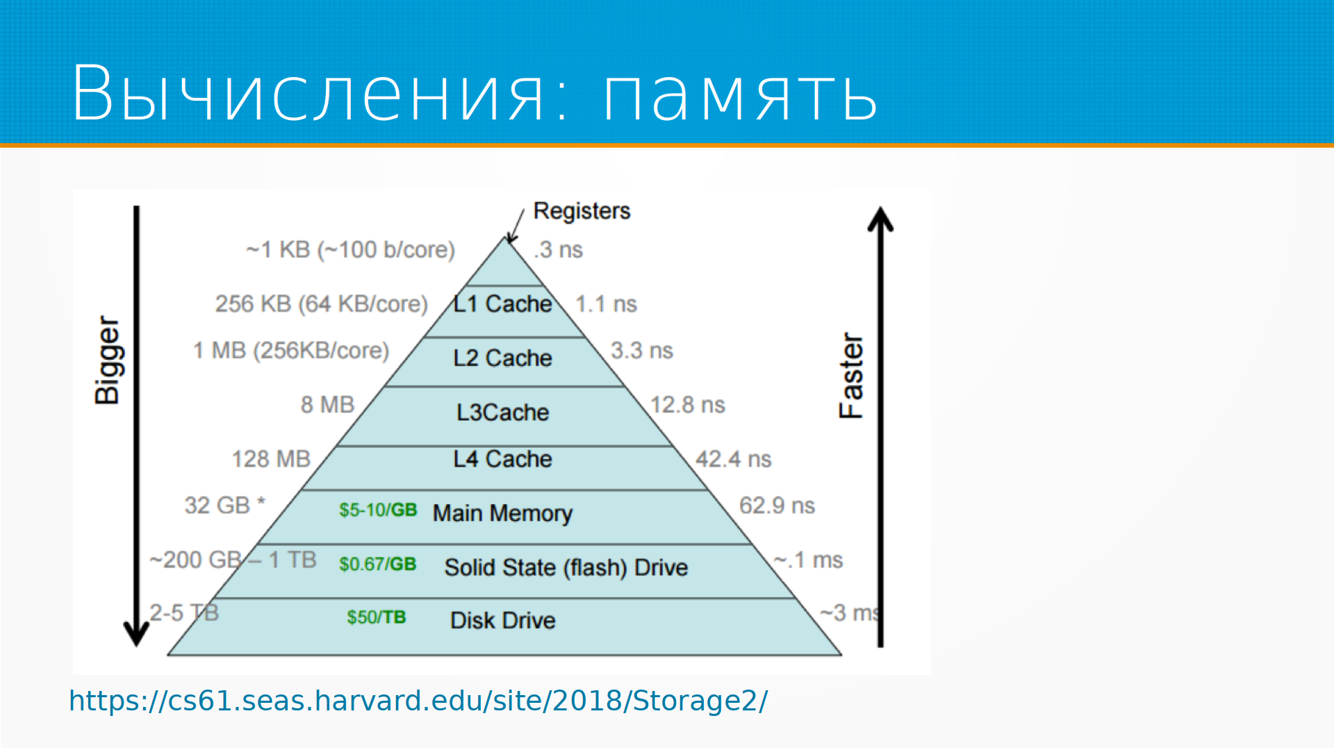 По скорости, как я уже говорил — чем дальше от вычислительного ядра, тем скорость меньше. И вот на этой диаграмме есть примерное, по состоянию на 2018 год, сейчас все немножечко легче стало, но, тем не менее, примерное соотношение скоростей. То есть в регистры вы получаете доступ условно за 3 наносекунды, а для того, чтобы прочитать что-то с диска, вам нужна 1 миллисекунда. И разница огромная, но разница и в скорости, и в вместимости.