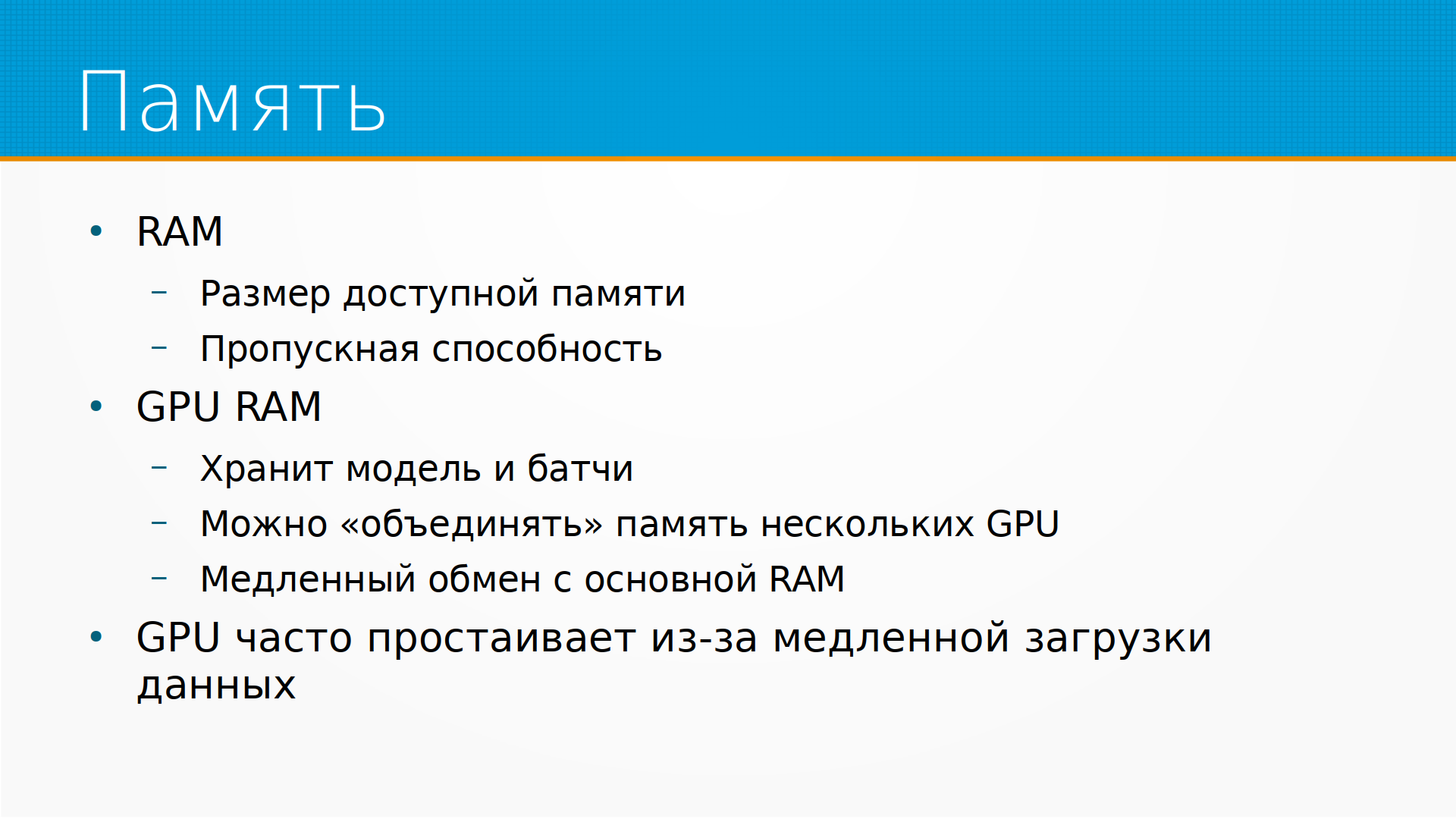 Но сейчас, поскольку мы используем CUDA, CUDA прячет от нас этот кошмар, нам достаточно просто помнить, что у GPU очень медленный обмен с основной памятью. И часто встречаются ситуации, когда мощные быстрые видеокарты, то есть V100, A100, простаивают большую часть времени, то есть у нее загрузка 15-30%, просто потому, что не успевает подгружать данные. То есть считаются данные быстро, а подгружаются данные медленно.