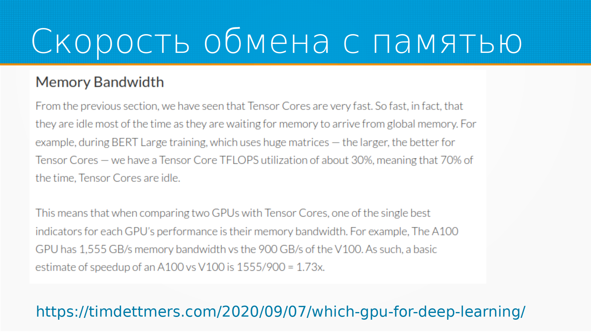 Вот в частности цитата. Ребята использовали, правда, не CUDA-ядра, а так называемые Tensor Cores. Они очень быстрые, и у них не получалось загрузить их больше, чем на 30%. То есть все упиралось в производительность памяти.