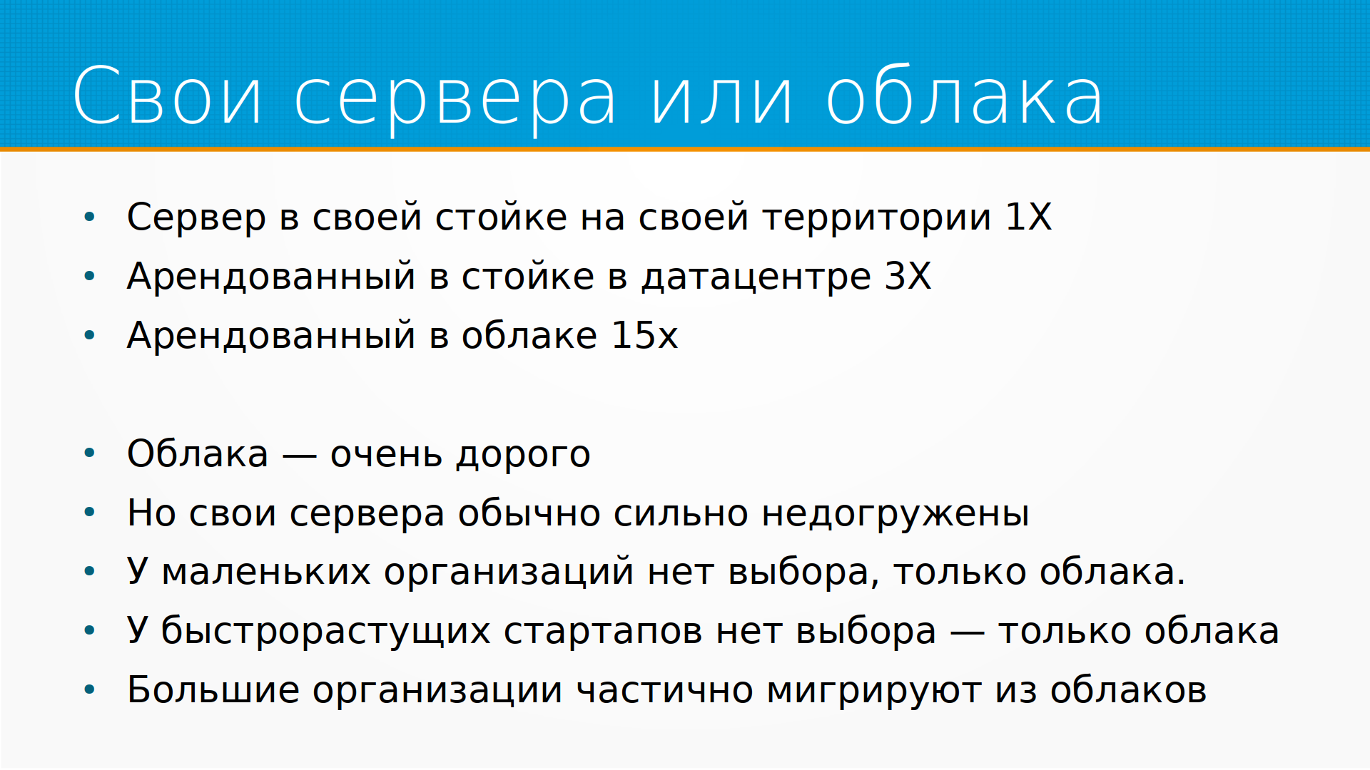 Что выбрать, свои сервера или облака? Ну, условно можно сказать, это такие очень в попугаях измерения, что если сервер на своей стойке на своей территории, скажем, обойдется вам, например, в 100 тысяч рублей, то арендованный в стойке обойдется вам, допустим, в 300, а арендованный в облаке съест у вас полтора миллиона за это же время. И зачем же тогда брать в облаке? Свои сервера обычно сильно не нагружены. Облако позволяет вам взять столько вычислительной мощности, сколько нужно вам прямо сейчас. Сервера мы вынуждены покупать про запас, потому что, не дай бог, придет пик, мы должны иметь возможность его обработать.