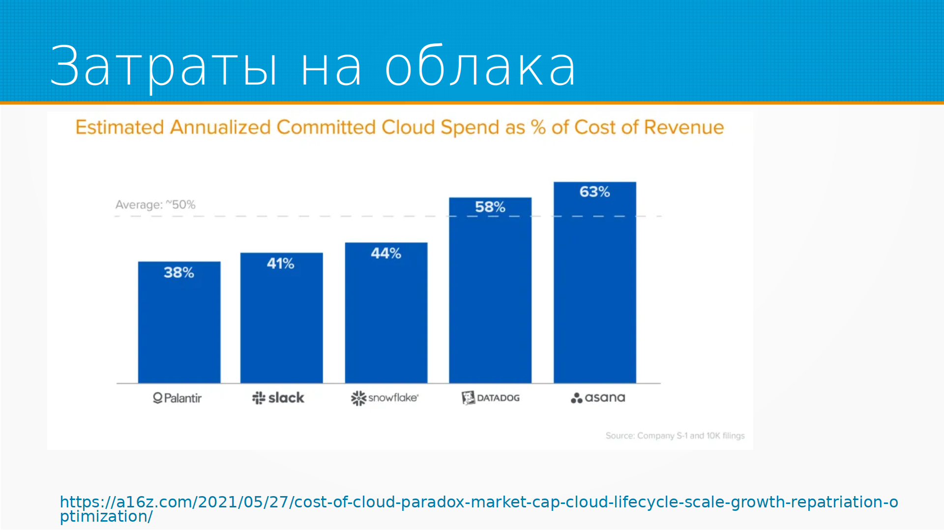 Затраты на облака составляют самый большый, непрерывный кусок затрат современных стартапов, о которых мы помним. То есть вот Asana — здесь оценки, то есть на самом деле это не рассказ, сколько Asana тратит, это по косвенным признакам аналитики оценили, сколько у них денег уходит от общих затрат на облака. И видим, что немало — в среднем половину.
