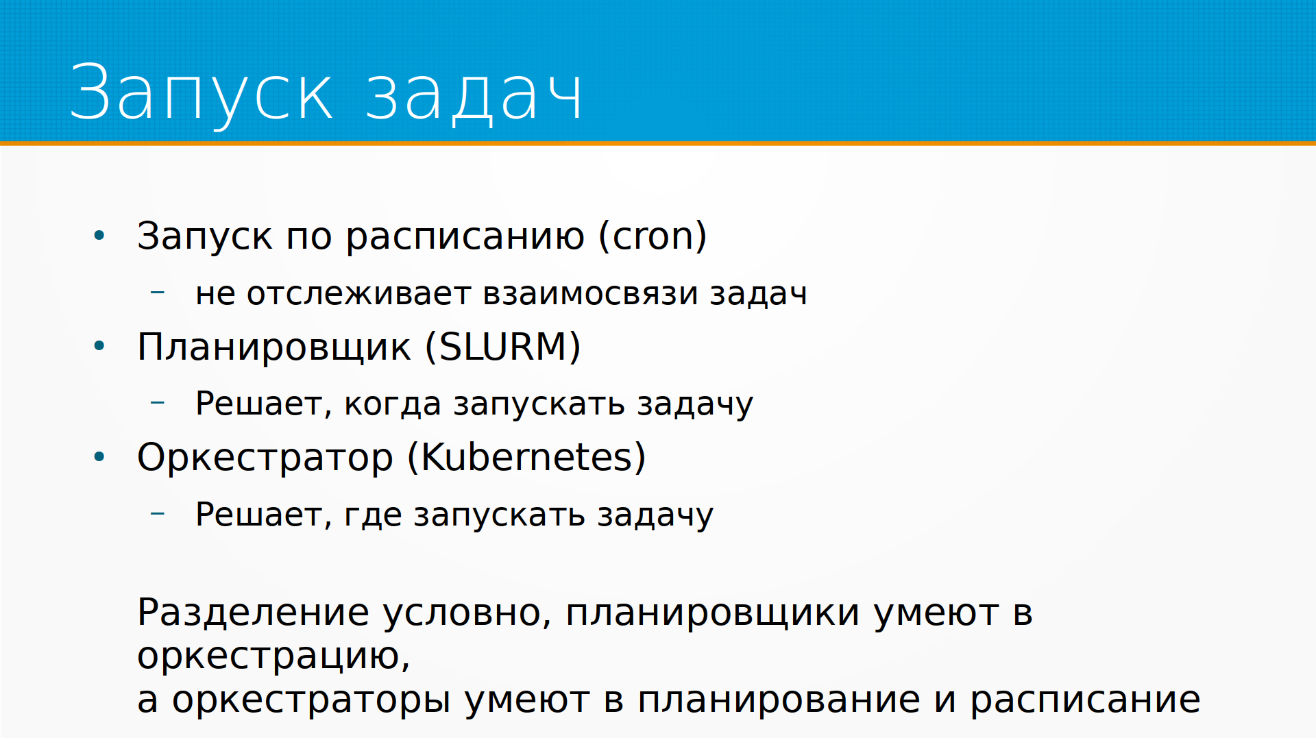 Дальнейший уровень развития — это планировщики, например, SLURM. Планировщик решает, когда запускать задачу. И оркестраторы — оркестраторы решают, где запускать задачу. Самый популярный оркестратор – это Kubernetes. В принципе, все планировщики так или иначе умеют в оркестрацию, и все оркестраторы так или иначе умеют в планирование. В общем, это условные разделения. Это способ думать. Планировщик решает, когда запускать задачу, оркестратор — где.