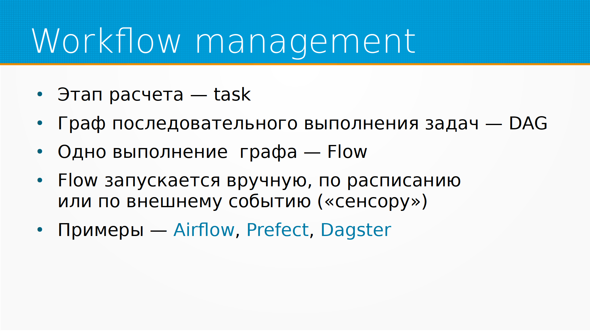 Плюс у задач есть последовательность, как я говорил, допустим, pipeline из пяти задач, и мы должны отслеживать эту последовательность. Для этого есть системы workflow-менеджмента, то есть управление потоком задач. Этап расчета в их терминах – это обычно task; граф последовательного выполнения задач – это directed acyclic graph, направленный ациклический граф, то есть в нем нет петель; и одно выполнение графа – это, например, flow. И поток, flow, запускается вручную, по расписанию или по какому-то внешнему событию, в Airflow и Dagster это называется сенсоры, то есть что-то стряслось в окружающем мире, и мы запустили flow. Примеры систем workflow-менеджмента – это, например, Airflow, Prefect и Dagster, сейчас мы по ним бегом пробежимся, по верхам.