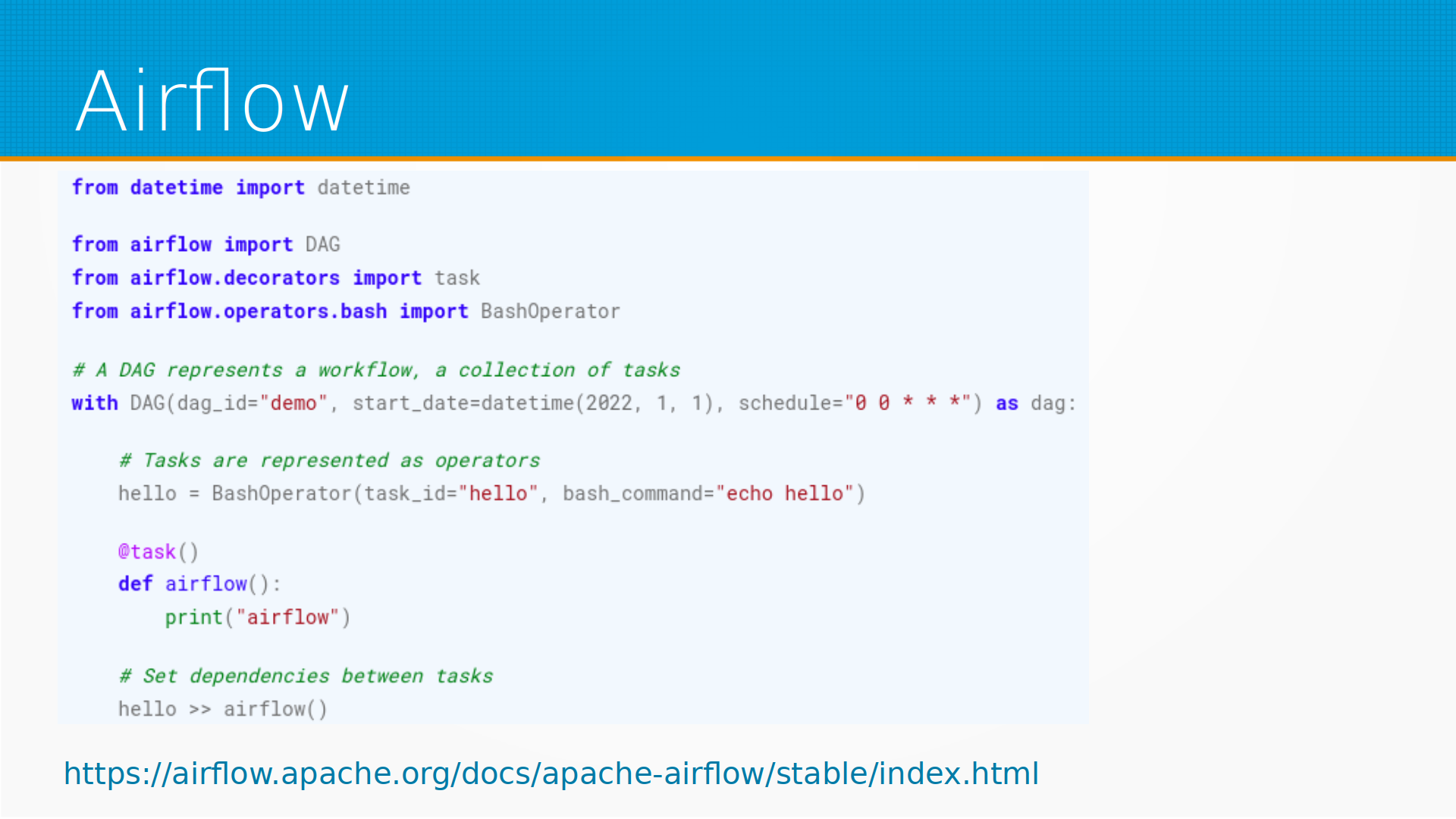 Вот пример того, как workflow может быть устроен в Airflow. То есть мы импортируем некоторый класс DAG, и нашу задачку, которая печатает Airflow, мы оформляем как task, и из набора этих task-ов собран наш граф выполнений.