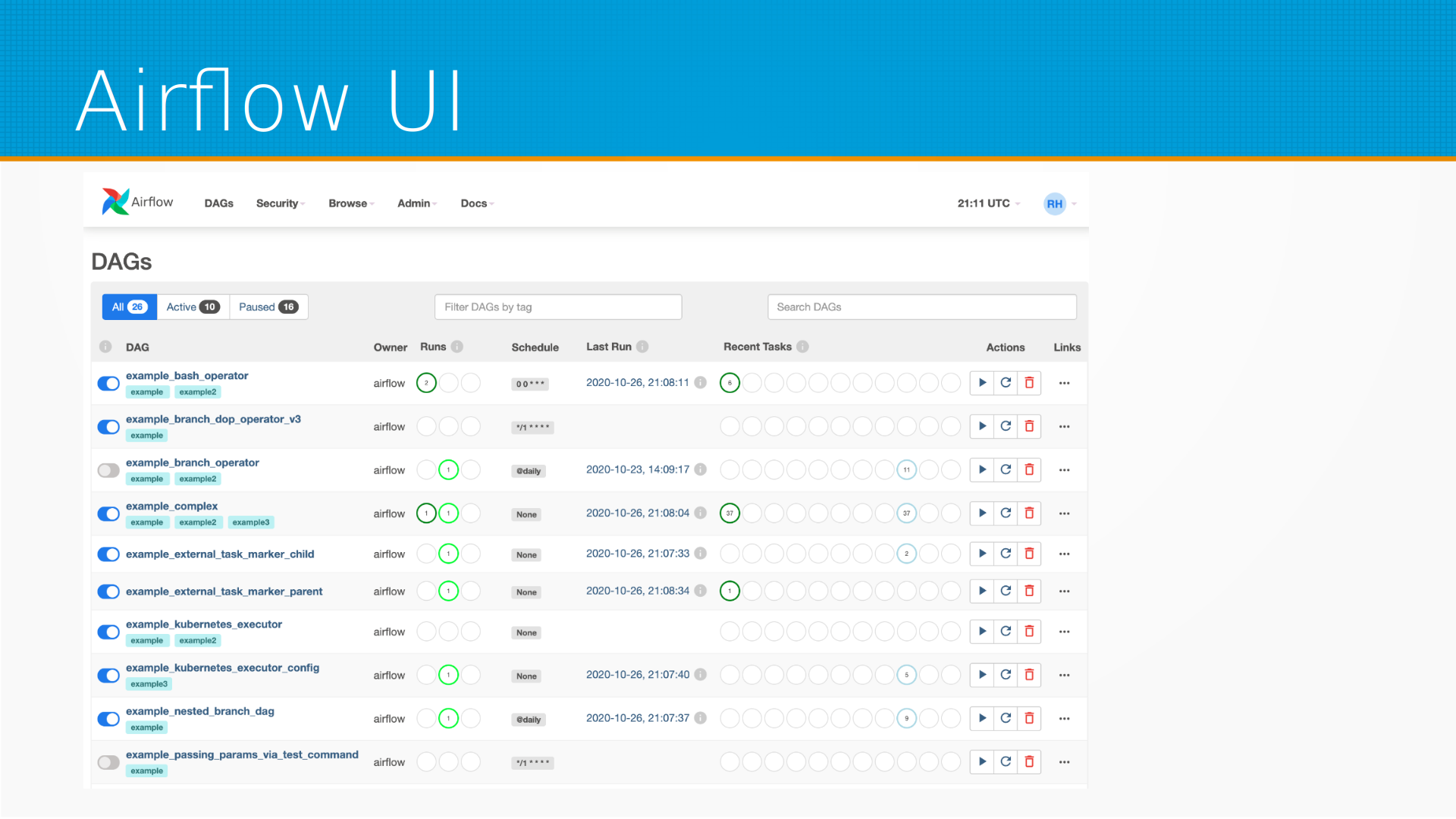Мы запускаем его на выполнение, и у нас есть пользовательский интерфейс, с которым мы можем ставить эти задачи в расписание, мы можем смотреть, как они запускались, смотреть их логи, запускать вручную и удалять-добавлять новые, смотреть, кто их разместил. То есть такое управление нашим пулом задач. Принято считать, что Airflow — для сравнительно медленных задач, то есть задач, которые вы запускаете какое-то количество раз в час, не чаще, чем раз в минуту.