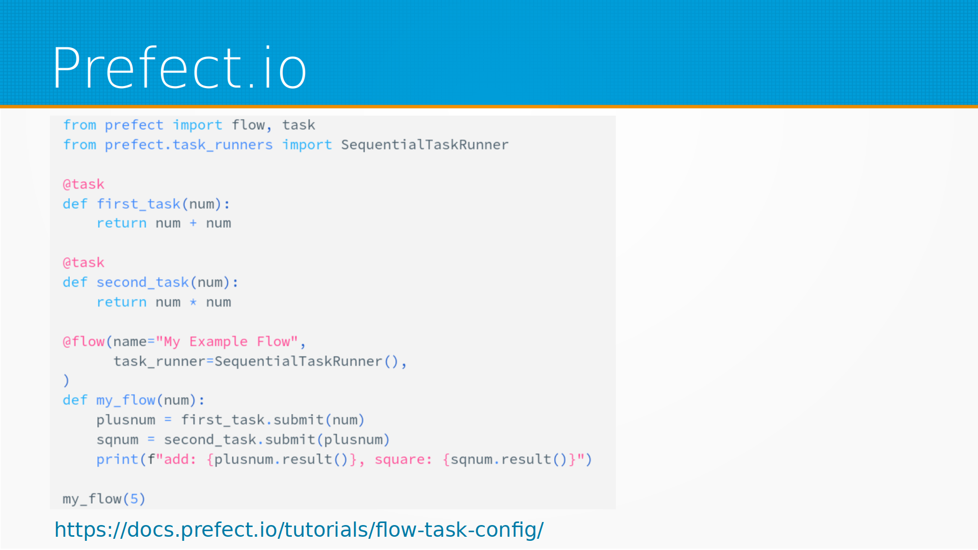 Следующее развитие, как говорят сами разработчики Prefect.io: мы взяли идею Airflow и сделали ее наконец-то нормально. Это тоже система управления потоком задач, где мы с помощью декораторов определяем наши задачи. В данном примере у нас есть первая задача first_task, вторая задача second_task, и собираем из них некоторый поток, в котором мы передаем одни таски в другие, и префект сам собирает из них граф и его выполняет. Граф может быть выполнен как на вашем компьютере, так и на каких-нибудь удаленных агентах, причем не обязательно, чтобы каждый таск был выполнен на одном и том же компьютере. То есть они выполняются, результаты собираются где-то и передаются на выполнение дальше.
