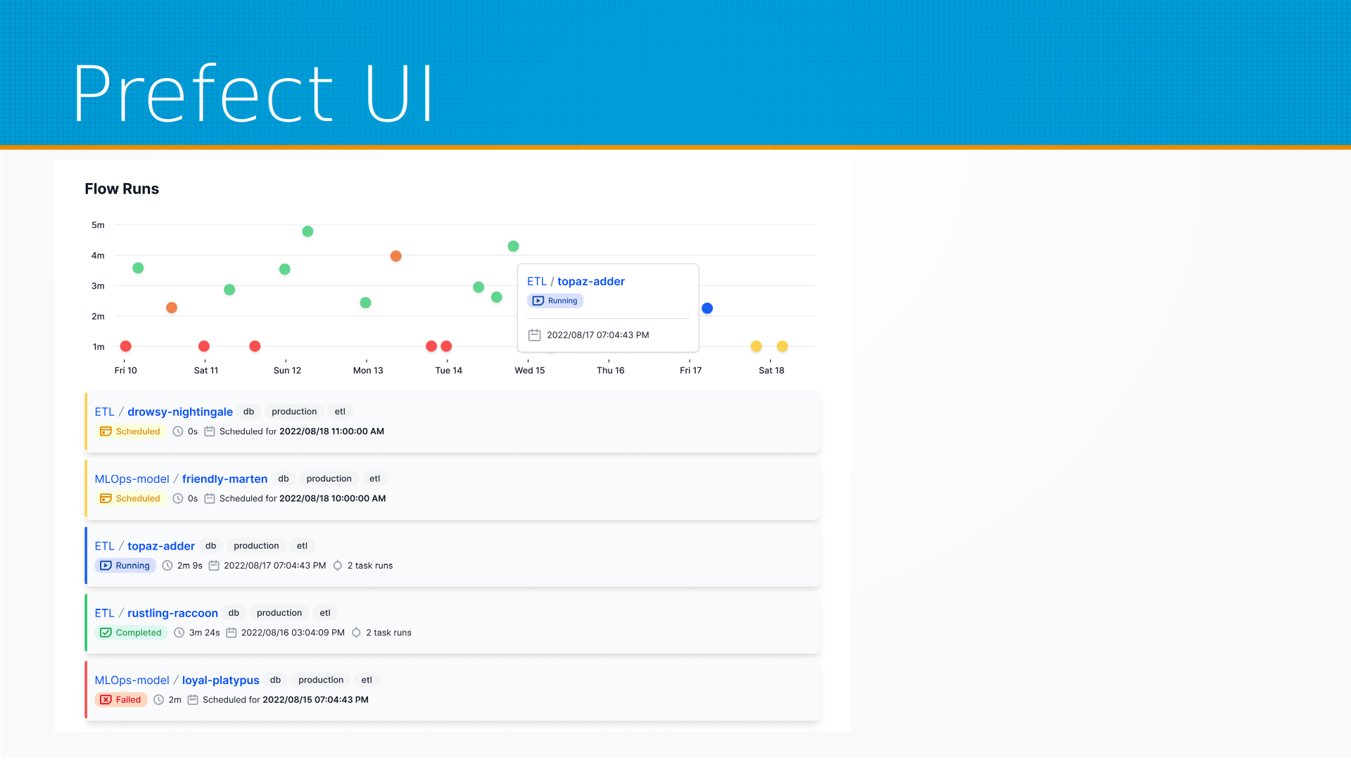 И вот это пример запуска flow в Prefect. Префект отслеживает версии flow, хранит историю и показывает, как те или иные потоки выполнялись, какие из них были выполнены успешно, какие запланированы, какие будут выполняться дальше.