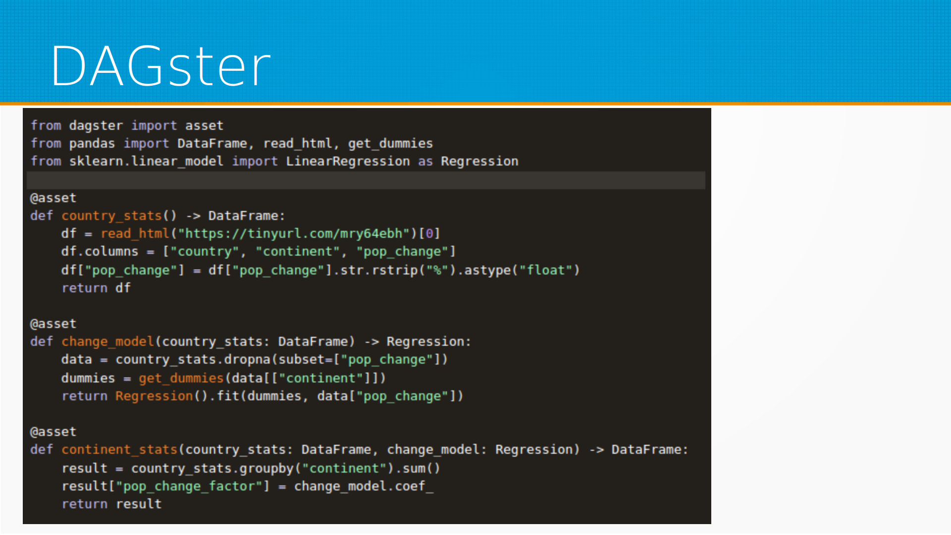 И третья система — это Dagster, у нее тоже есть SaaS-версия, вы можете запустить ее у себя, она похожа на Prefect. И вот тут вы определяете некоторые ассеты — это то, что таски у Prefect.
