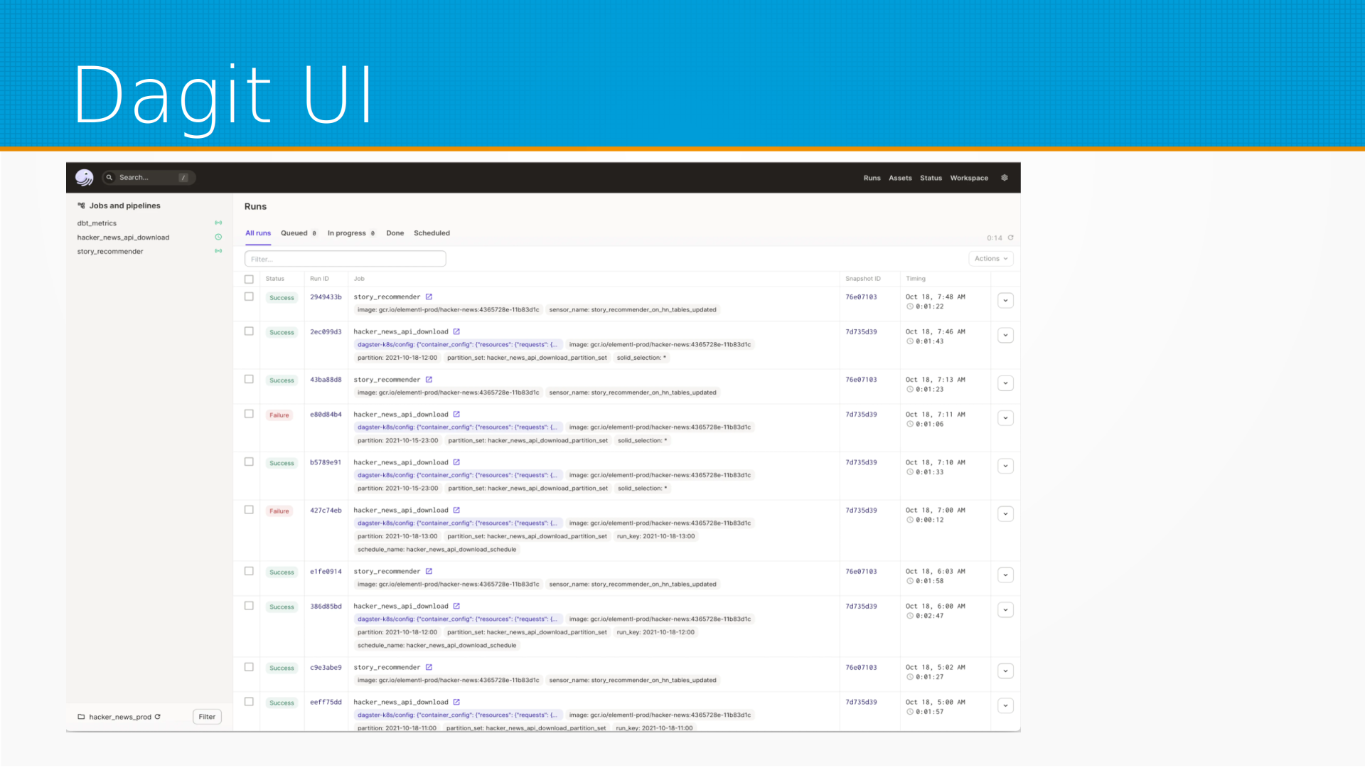 Dagster использует pydantic для того, чтобы определить структуру параметров, то есть что можно передавать между задачами, и у него свой пользовательский интерфейс есть, Dagit UI, который позволяет тоже смотреть, когда кто запускал, когда что будет запущено, что где сломалось и так далее.