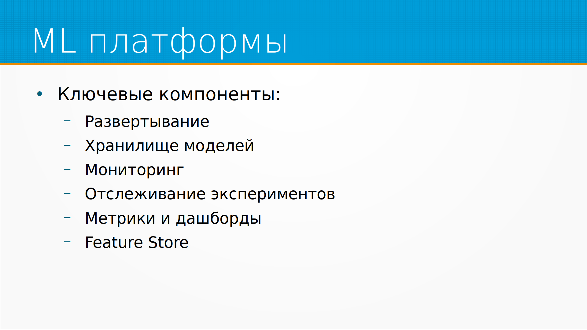 Следующий этап усложнения инфраструктуры — это ML-платформы. Ключевые задачи, которые решают ML-платформы — это развертывание, хранилище моделей, мониторинг, отслеживание экспериментов, сбор метрик, дашборды и feature store, то есть витрины данных. Строго говоря, feature store — это не совсем витрины данных. И обо всем этом мы уже говорили в предыдущих лекциях, а сейчас затронем немножечко фич-сторы.
