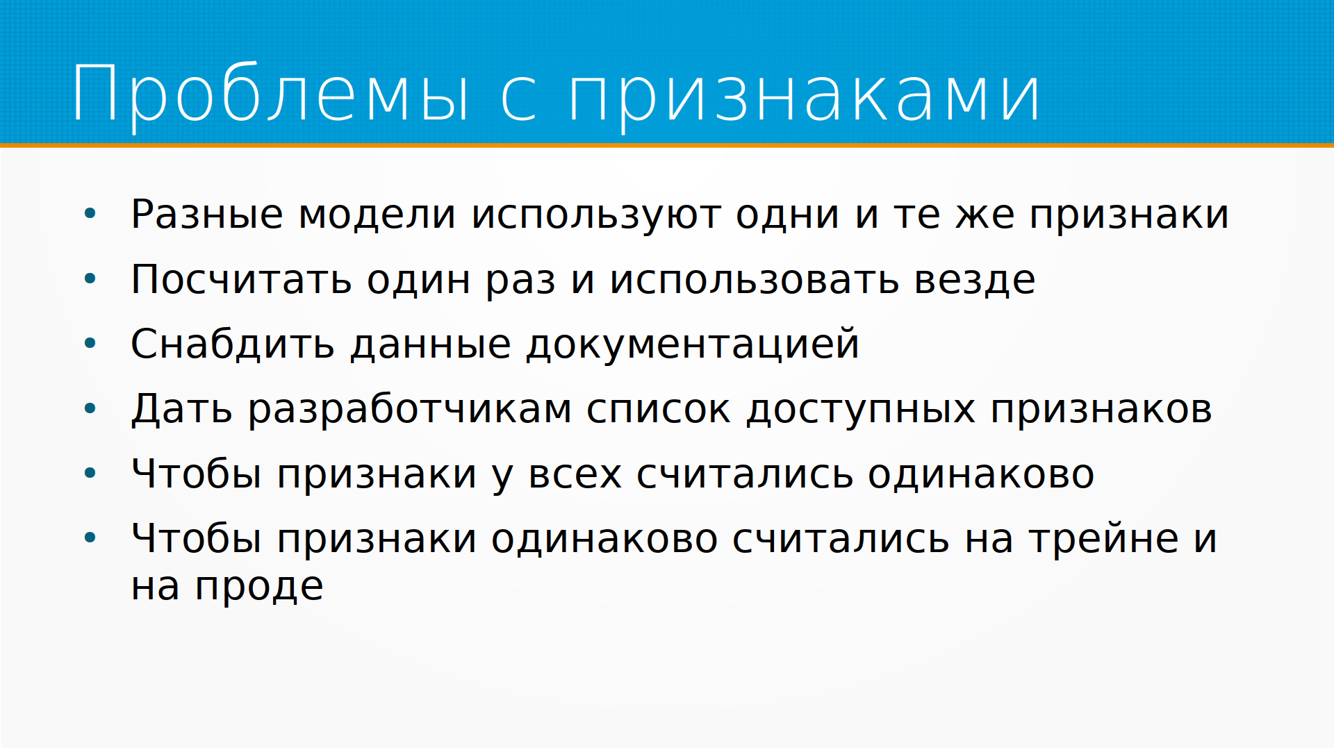 Еще, даже если у нас разработчики считают их одинаково, мы не можем быть в этом уверены. Например, кто-то считает среднесуточные продажи, и при этом он считает сутки по гринвичу, а какая-то другая команда считает среднесуточные продажи, но она считает их в среднем по Москве, то есть от нуля Москвы до нуля Москвы. Кто-то считает, допустим, от нуля Новосибирска до нуля Новосибирска. Это просто живой наш пример, мы с этим сталкиваемся постоянно, что разные смежные организации считают одни и те же признаки по-разному. И здорово было бы иметь такой фич-стор, где у нас хранятся насчитанные признаки, они считаются всегда одинаково, все знают, как они считаются.