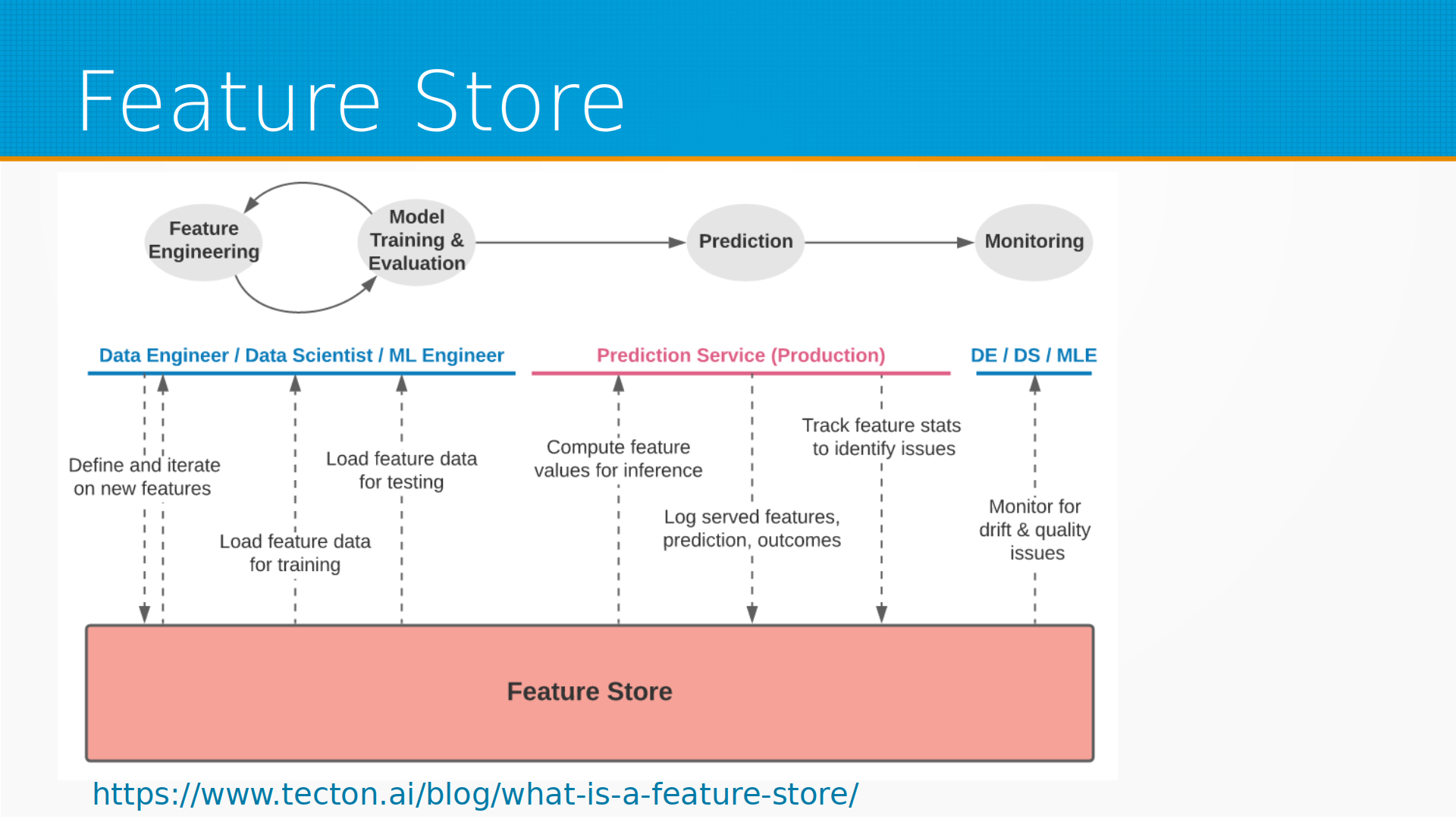 И фич-стор решает эту проблему на всем этапе жизненного цикла. Все задействованные в работе модели люди и сервисы работают с фич-стором. То есть в самом начале, на этапе-фич инжиниринг, дата-инженер вместе с дата-саентистом определяет, какие возможны признаки, потом дата-саентист смотрит, какие признаки доступны, работает с ними, потом ML-инженер выгружает эти признаки для тестирования, работы, готовит их. После этого prediction сервер берет сервисы оттуда, готовит готовые признаки на инференсе при поступлении новых данных, считает какие-то статистики по признакам, чтобы можно было мониторить качество данных. И дата-инженер смотрит в этом фич-сторе, анализирует, нет ли у нас каких-нибудь проблем со сдвигом данных или выбросами и так далее.